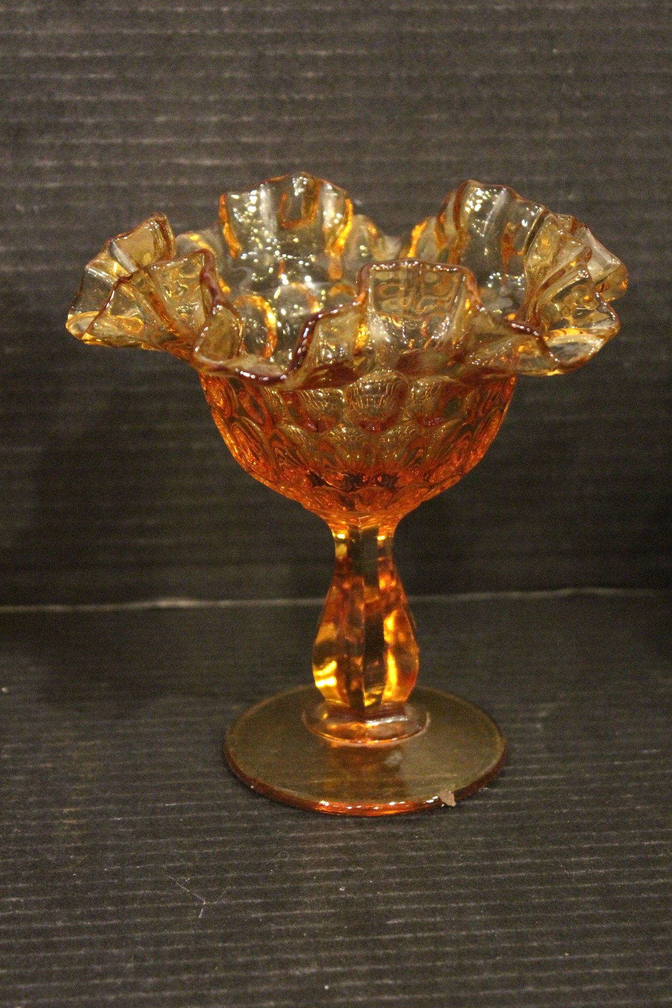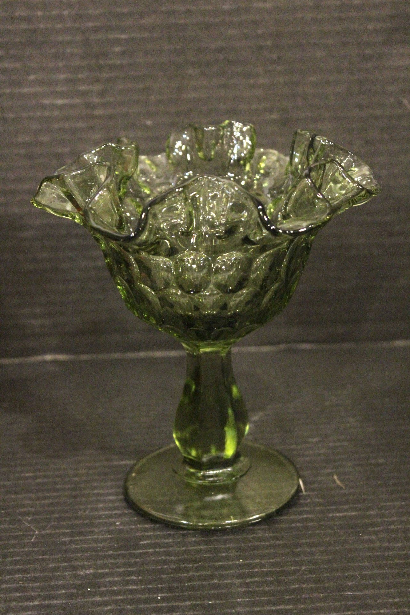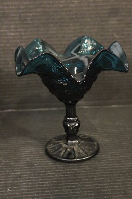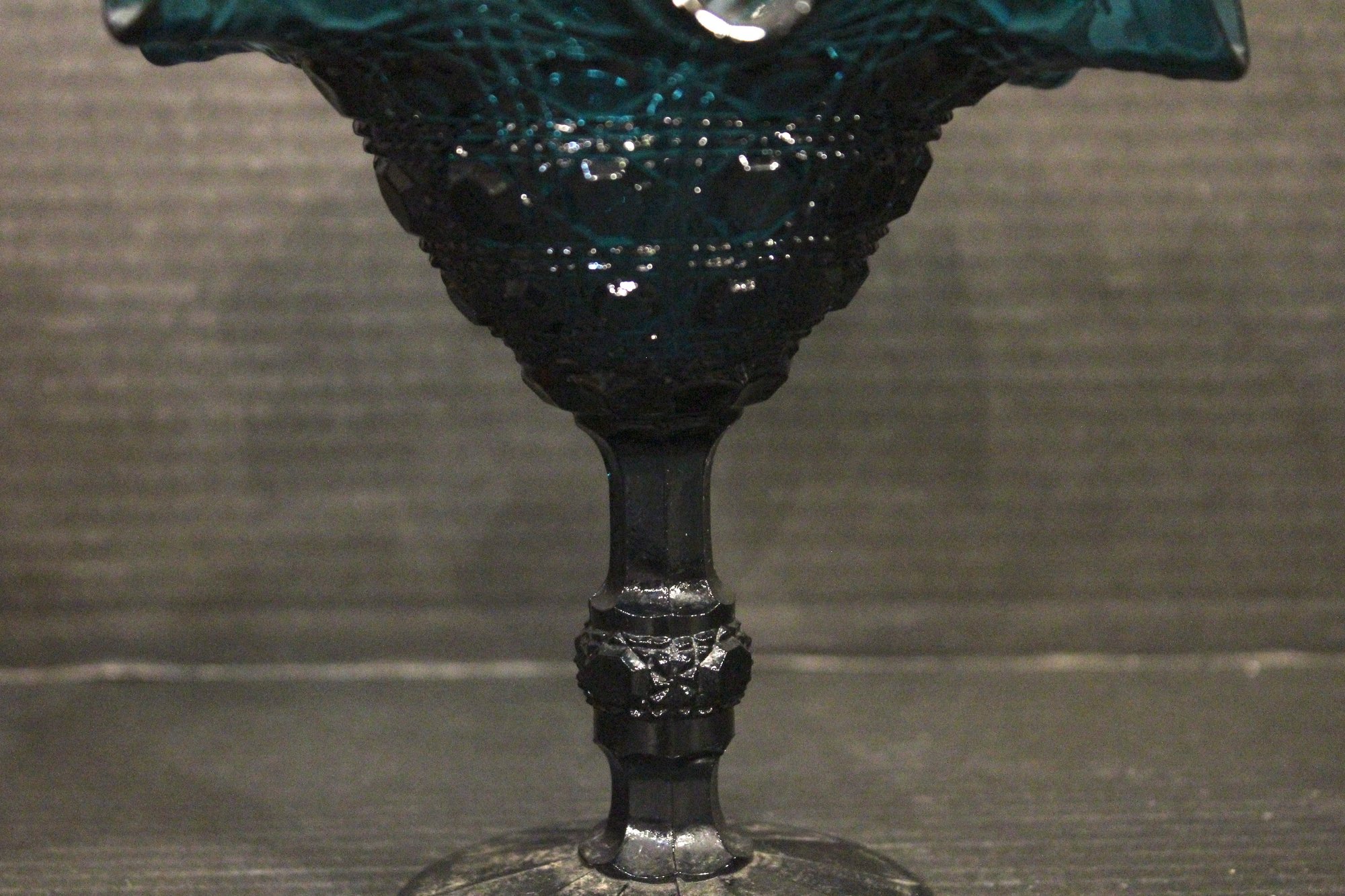 3 vintage Fenton glass ruffled compote dish, and a vintage cane pattern or diamond point teal blue glass compote candy dish with a ruffled edge 6" x 6".