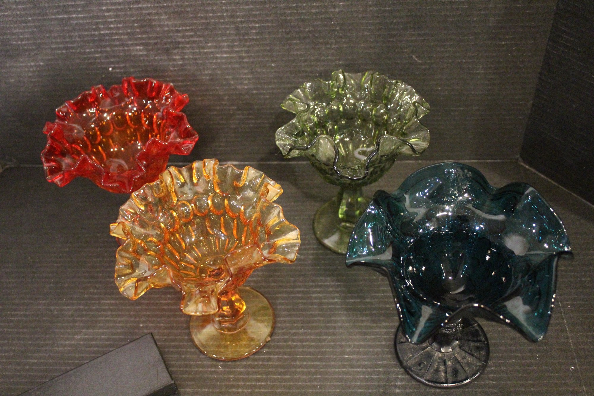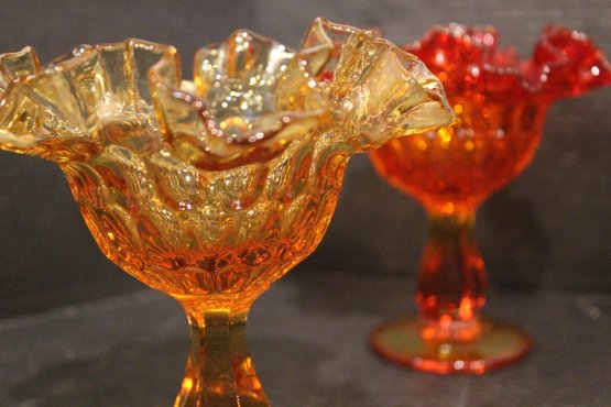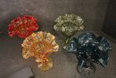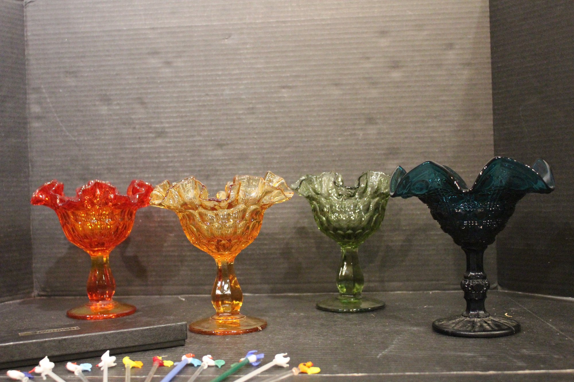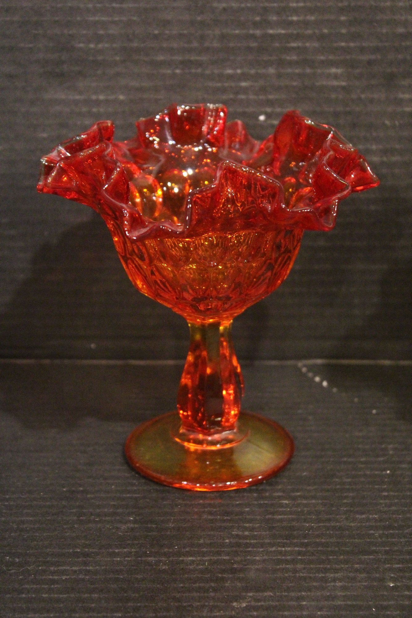 3 vintage Fenton glass ruffled compote dish, and a vintage cane pattern or diamond point teal blue glass compote candy dish with a ruffled edge 6" x 6".