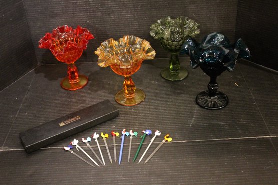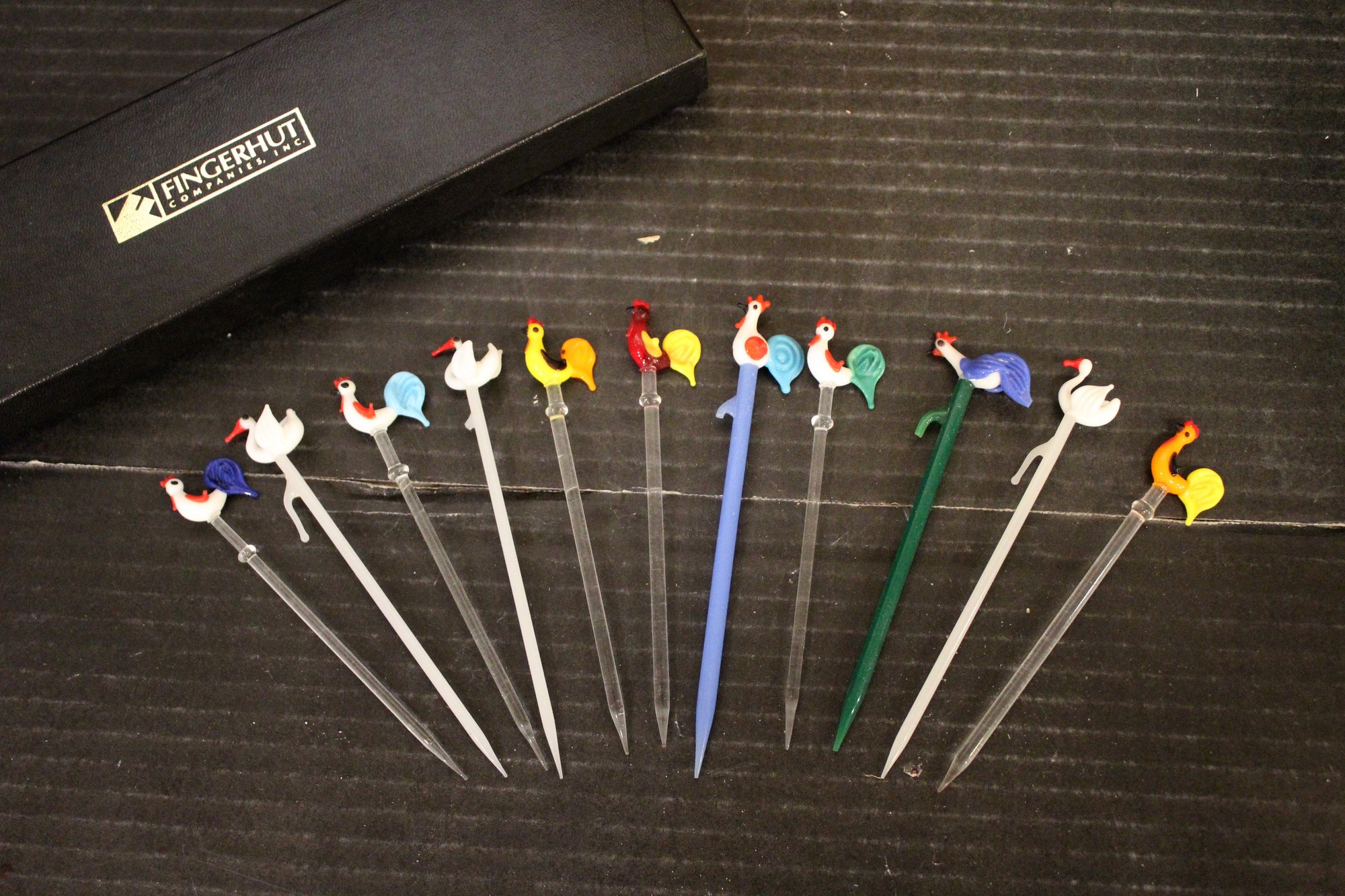 vintage, hand-blown glass cocktail or appetizer picks, also known as swizzle sticks, featuring rooster and bird figurines, These items can be shipped.