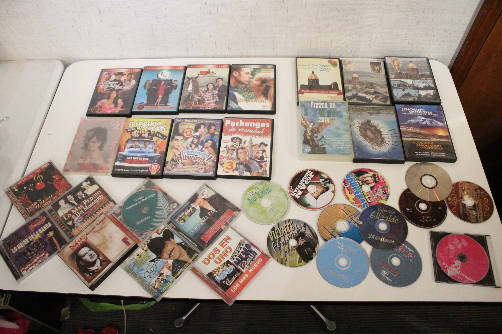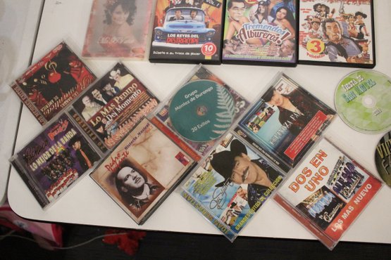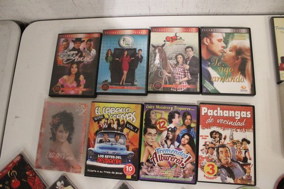 Collection of Spanish-language movies and regional Mexican music CDs/DVDs, featuring classic films, festival recordings, and popular artists such as Vicente Fernández, Valentín Elizalde, Jenni Rivera, and Antonio Aguilar. Ideal for fans of ranchera, banda, norteño, and traditional Mexican entertainment. Some of the multi pack DVDs are missing discs.
