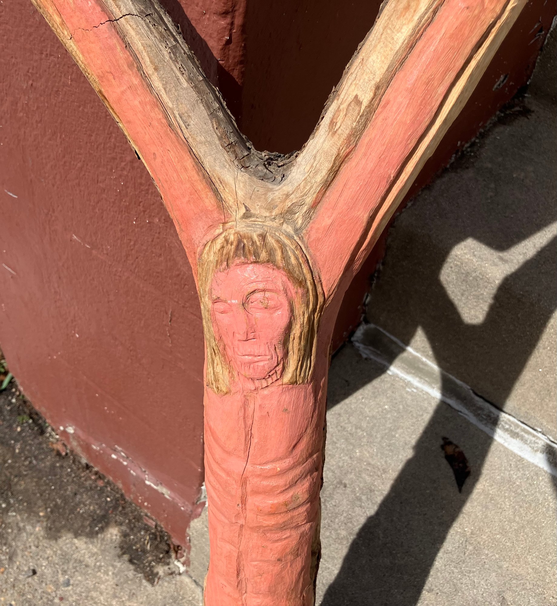 Folk art carving and painting of Jesus on the cross. Artist has taken a tree limb to recreate the crucifixion. 39" high 16" across at the hands