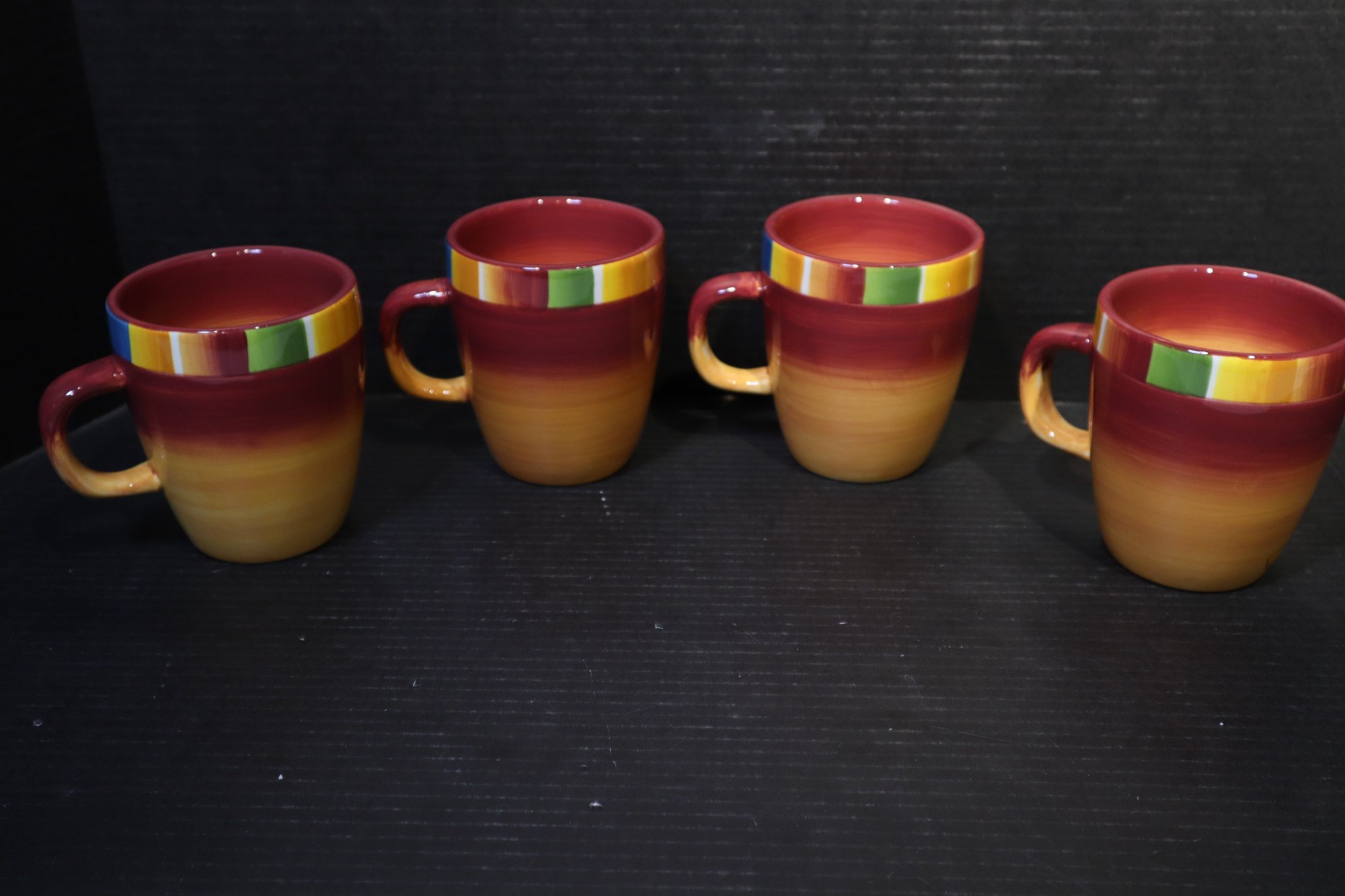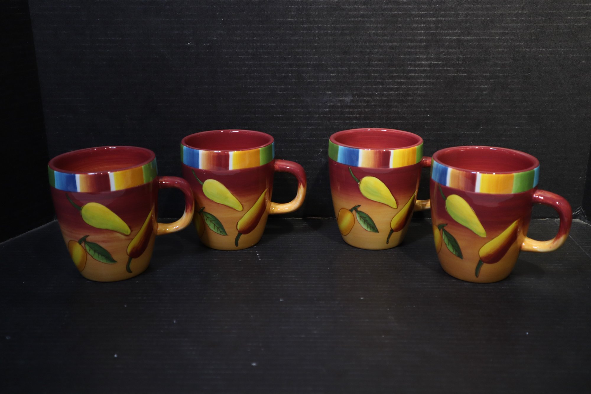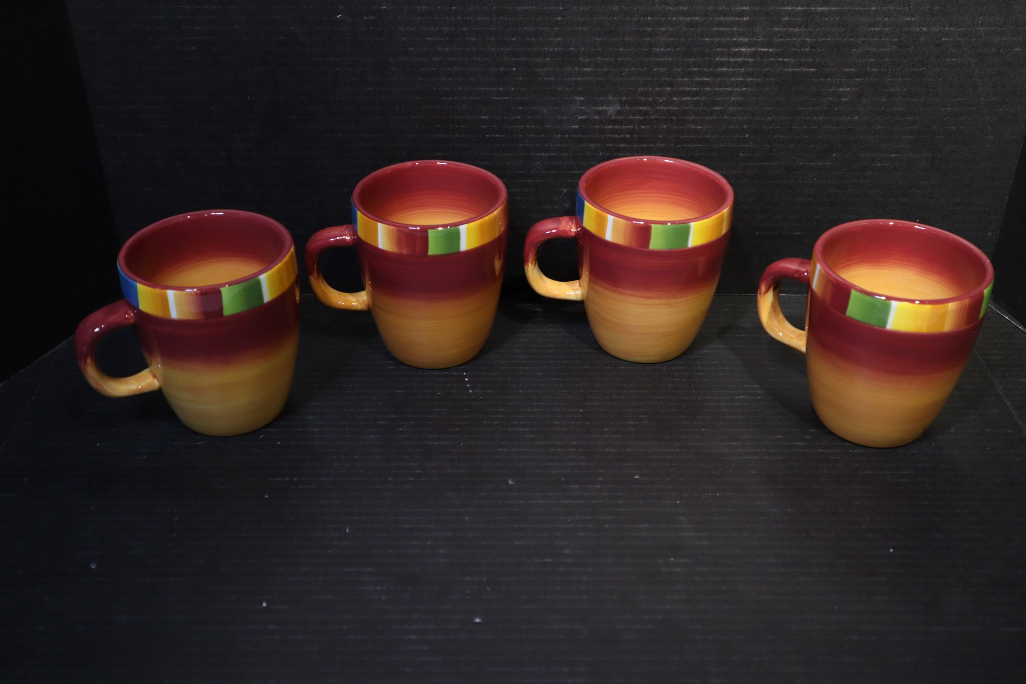 Four earthenware mugs from Noble Excellence's Hacienda collection. The Hacienda was a colorful line of dishware produced in the 1990's featuring southwestern patterns and designs. These mugs sport painted peppers on the front, and a sunburst pattern terminating in a multi-color striped rim. They are in incredible condition, and are microwave and dishwasher safe.