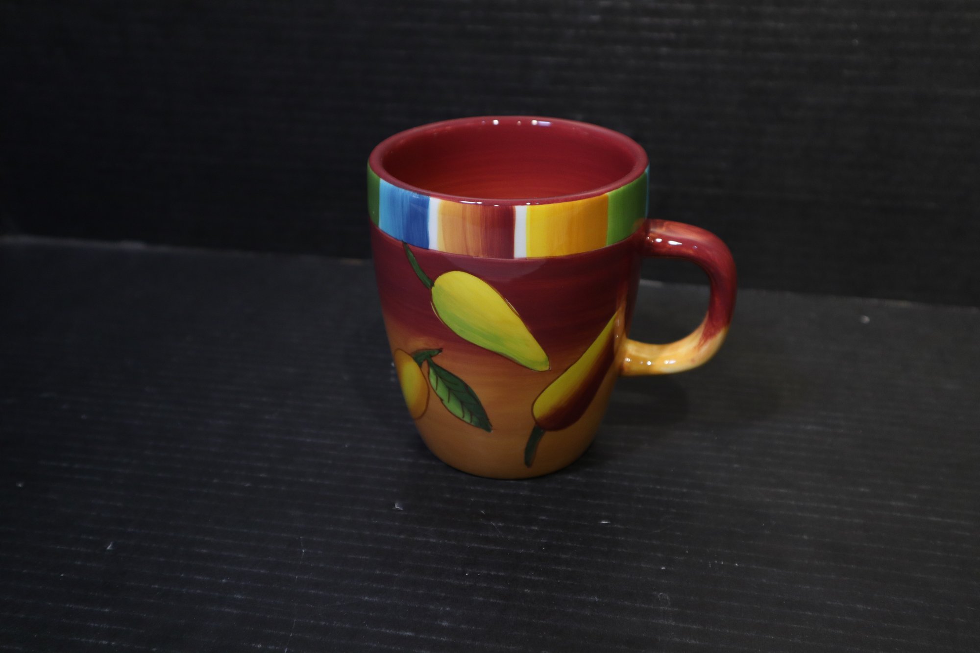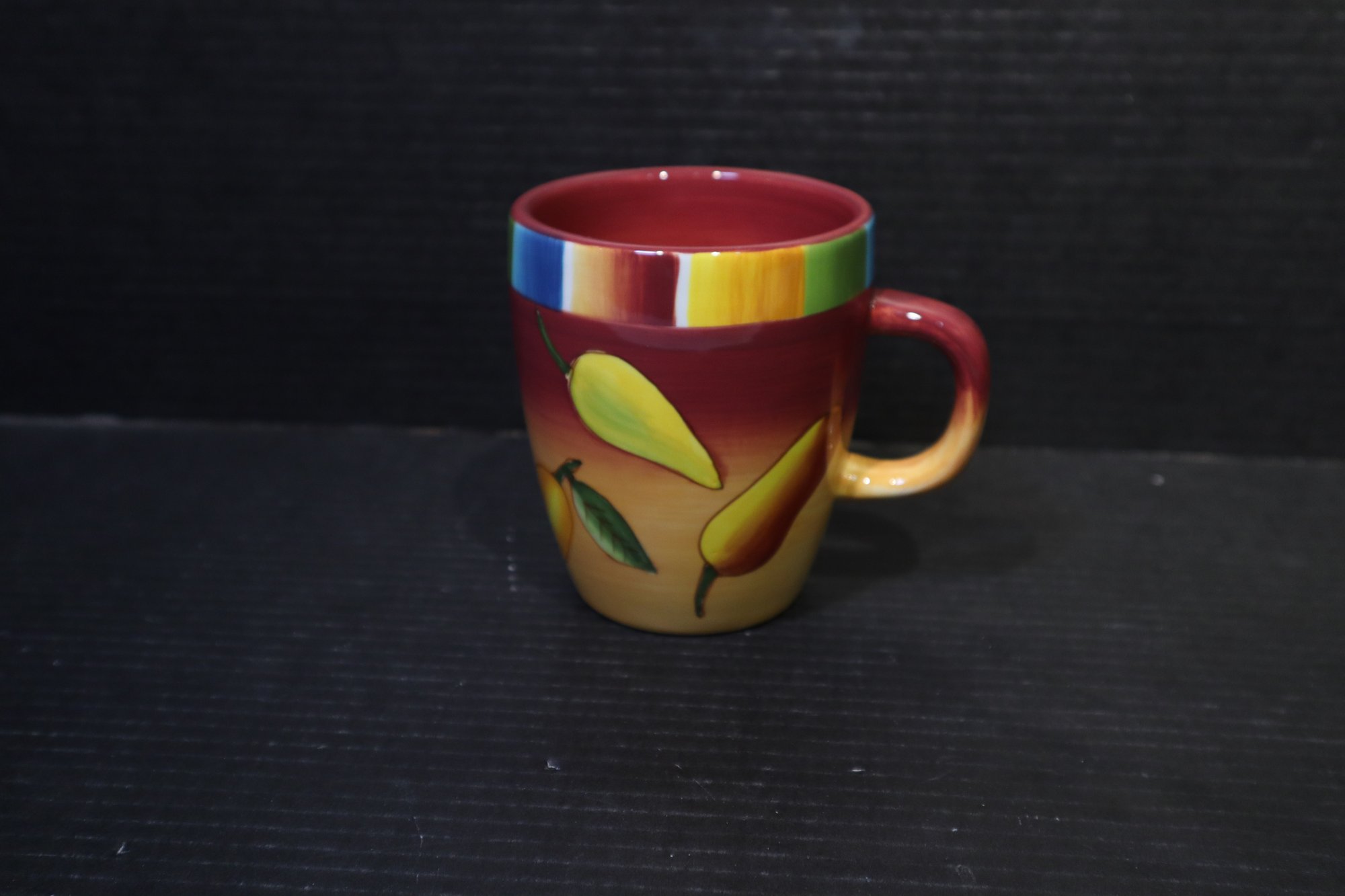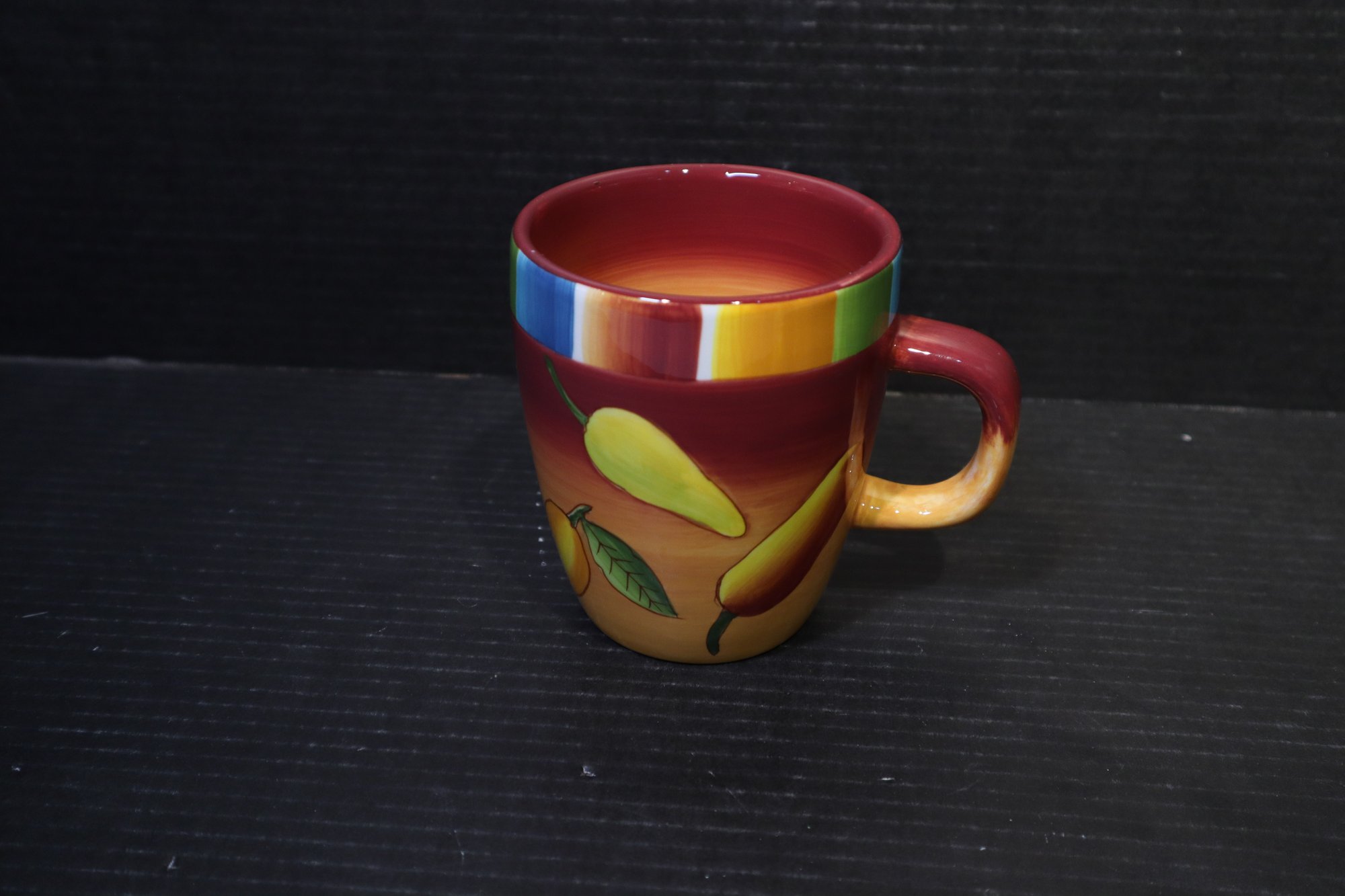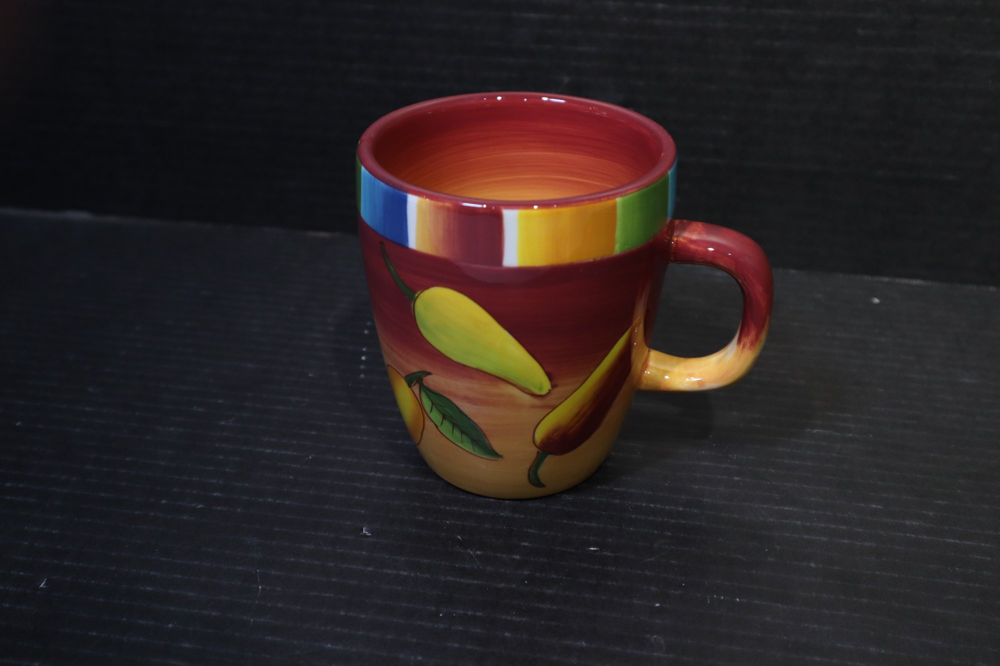 Four earthenware mugs from Noble Excellence's Hacienda collection. The Hacienda was a colorful line of dishware produced in the 1990's featuring southwestern patterns and designs. These mugs sport painted peppers on the front, and a sunburst pattern terminating in a multi-color striped rim. They are in incredible condition, and are microwave and dishwasher safe.