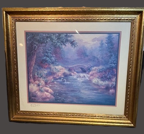 Framed art print featuring two swans in a landscape from Home Interior Gifts. Frame is wood and gold tint and in good condition, This item will not ship