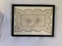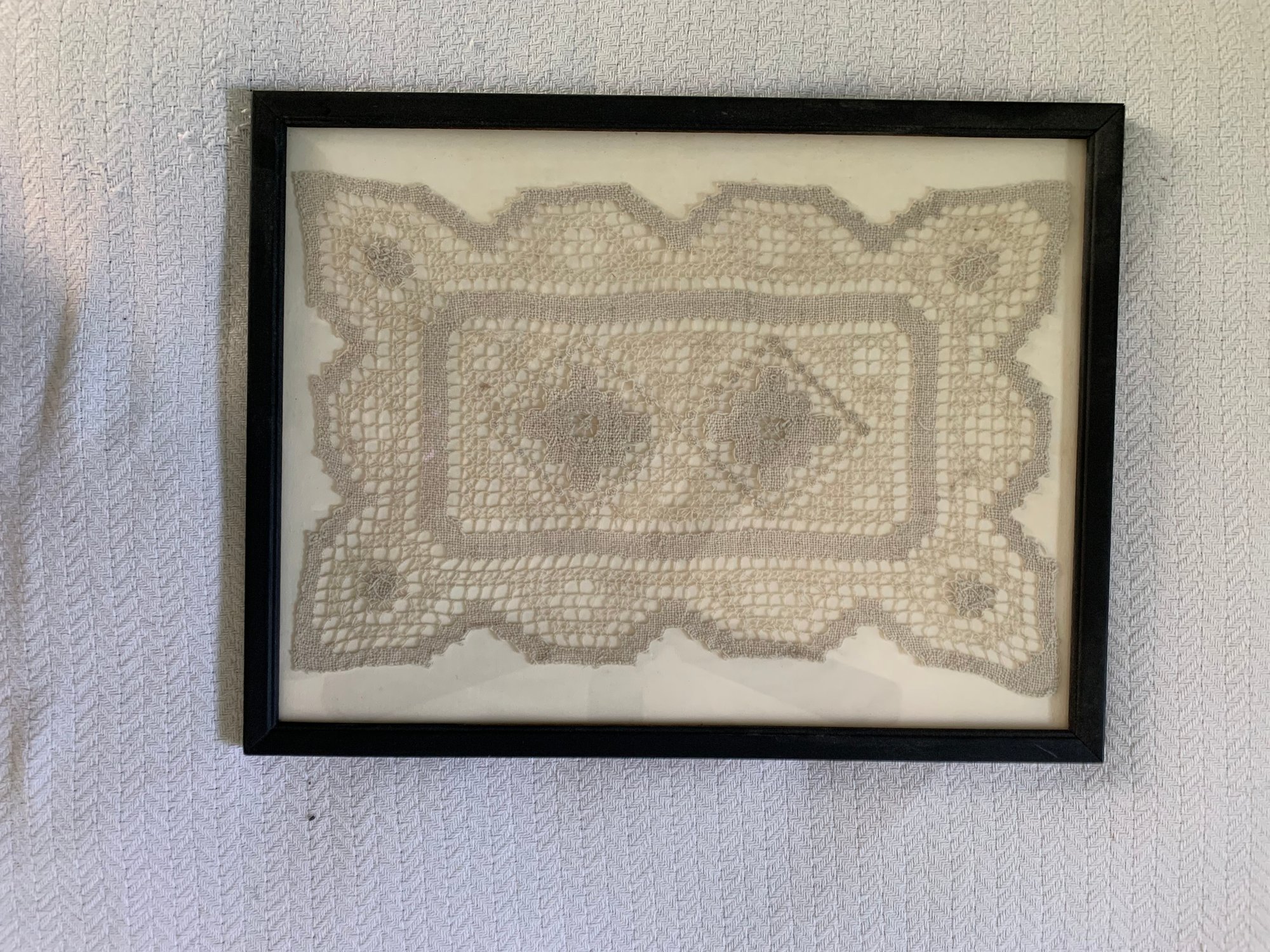 Framed Small lace table runner/mat. Frame is black. 17 x 13“ with wire hanger on the back - in good shape.