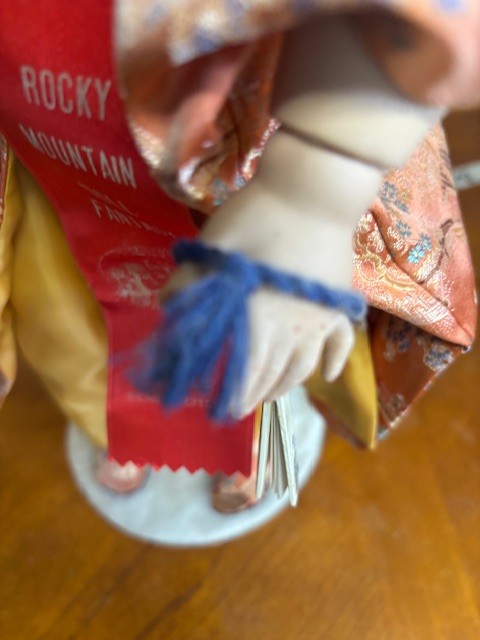 Hand painted face dressed in traditional kimono made of silk or similar materials, fully dressed with hair pins and fans in hands. Her head is a little wobbly as she has been in a box in storage for some time comes with a stand. This item ships