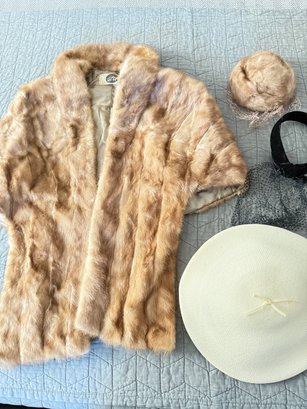 Fur stole and fur hat from May D&F. Black vintage mesh headband and bullocks off-white saucer hat. All vintage pieces from estate sale in good condition.