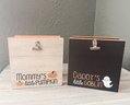 These are the cutest wood block Halloween photo frames! Two say "Mommy's Little Pumpkin" and two say "Daddy's little goblin." All four frames are circled with bright orange glitter, and all have a hole on the back to hang, if desired. But they are thick enough that they can stand on their own as desk or shelf frames.