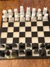 Hand carved stone chess set from Mexico. Board is approximately nine and three-quarter inches by nine and three-quarter inches. Pieces are approximately 1,2/8” tall to 2,1/8”. Includes 32 pieces. There is one extra white bishop versus a knight. In good condition no chips or cracks.