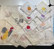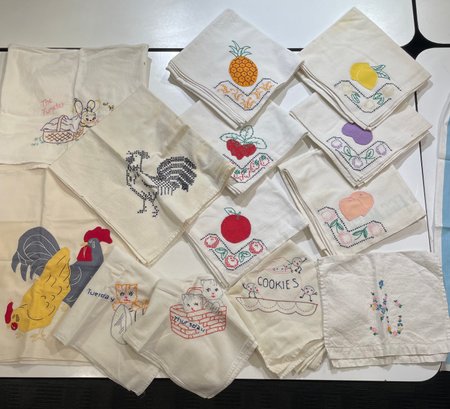 Vintage hand-embroidered and appliquéd dish towels with a variety fruits and animals . Various sizes, made from flour and egg meal sacks. Some stains.