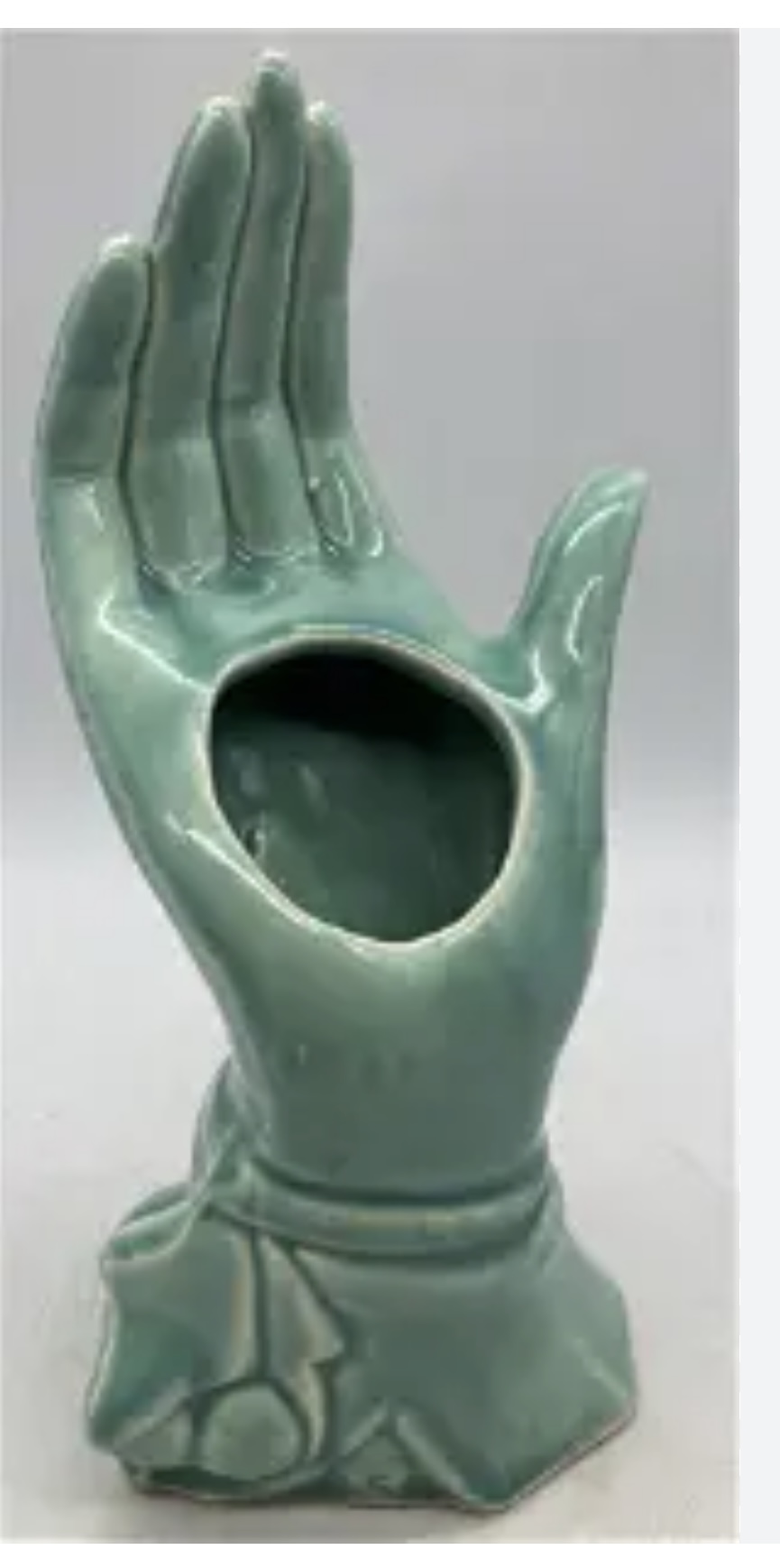 Blue ceramic hand planter. 3 of the fingertips and the wrist cuff are chipped, see photos.