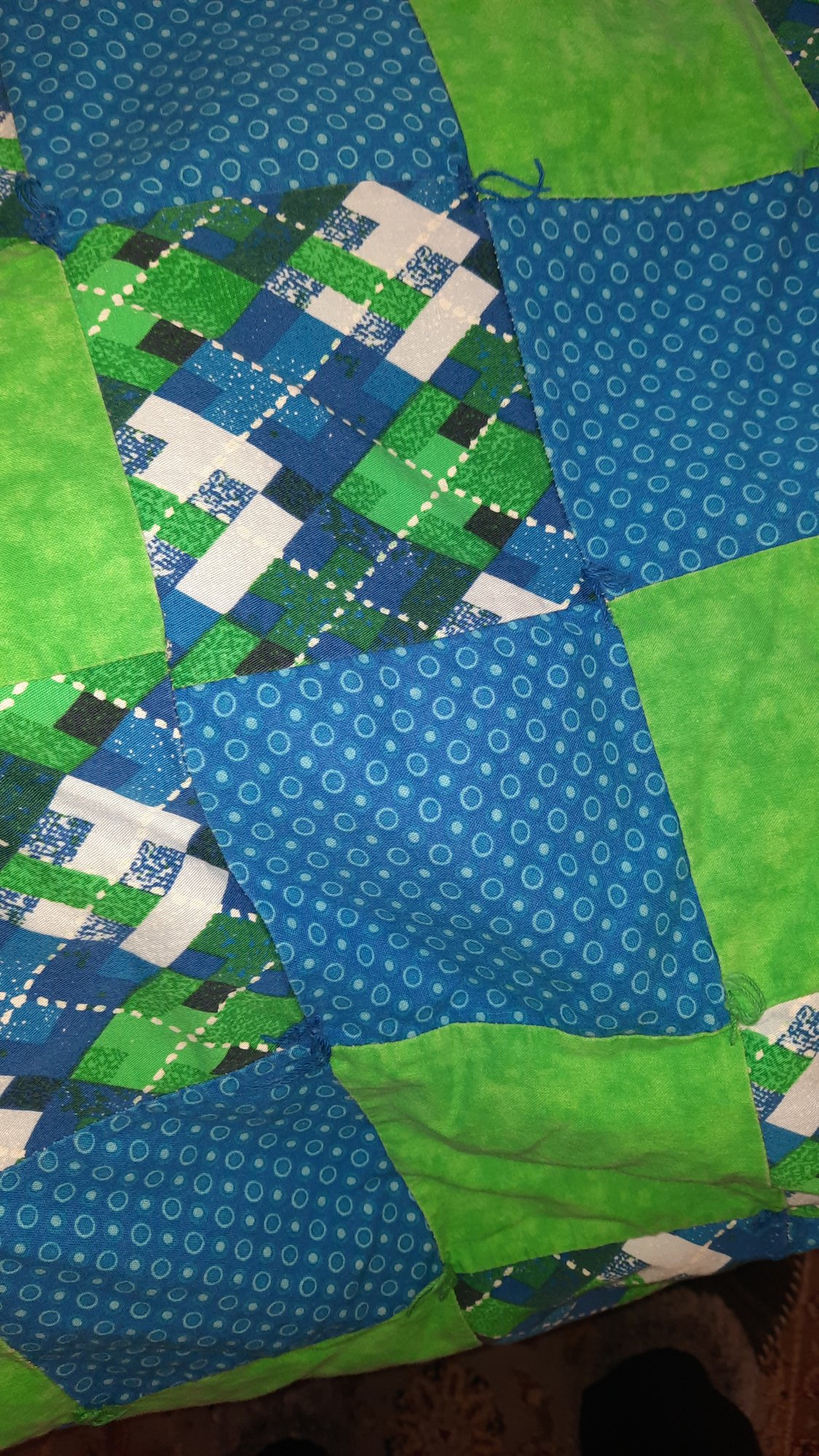 Great quilt for a teenager or youth. Colors are bright blue and green.