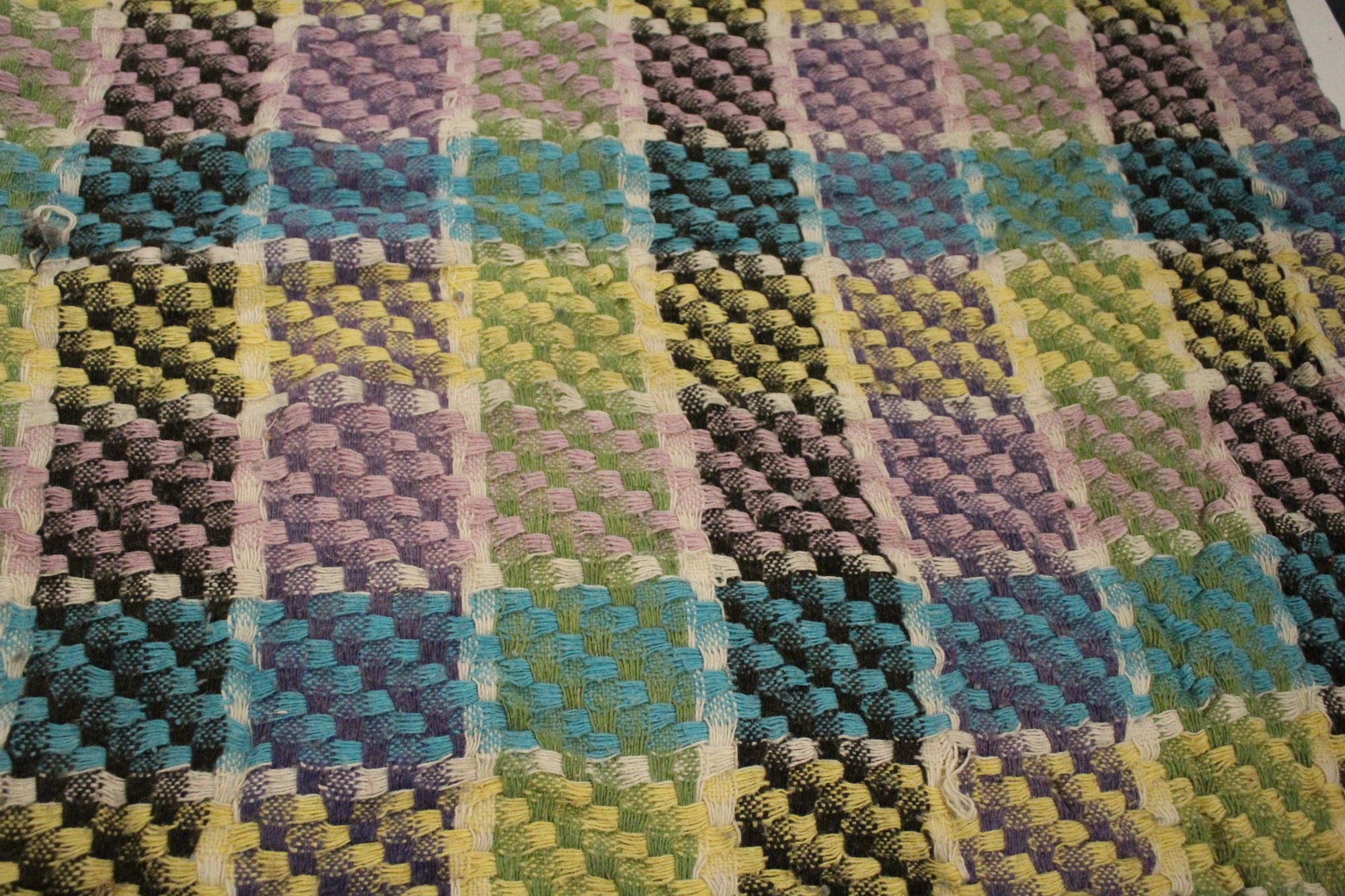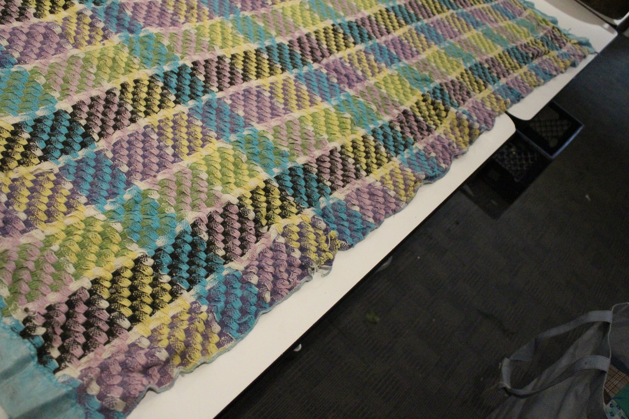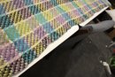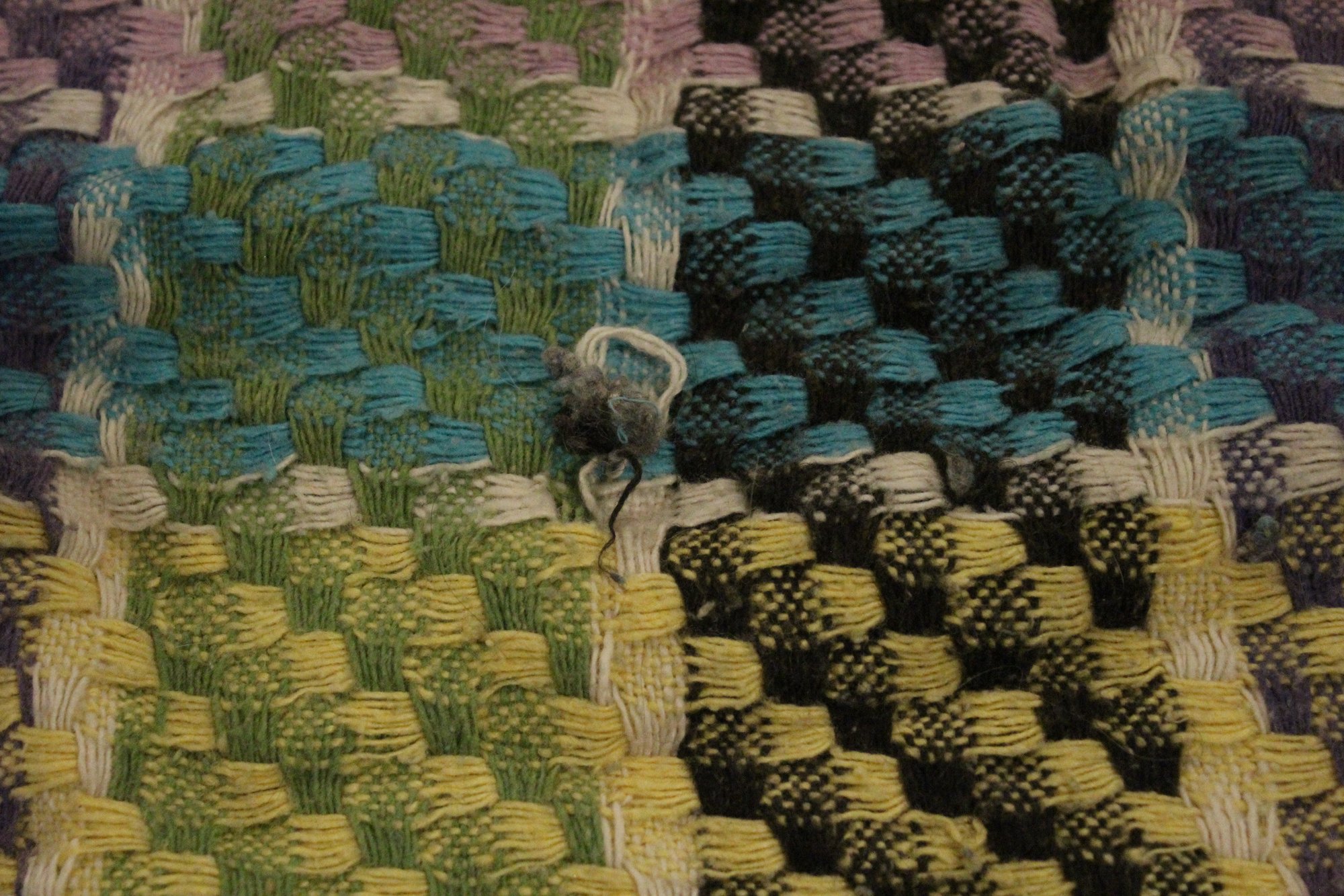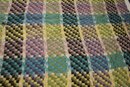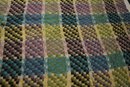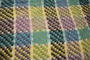 A large, green, blue, and purple, handmade plaid crochet blanket or afghan 76" x 58". damage along head and foot edges of blanket as pictured, with very minor damage in other places as pictured. This item can be shipped.