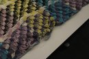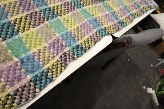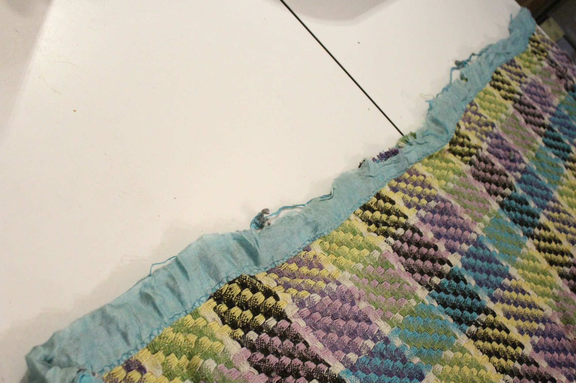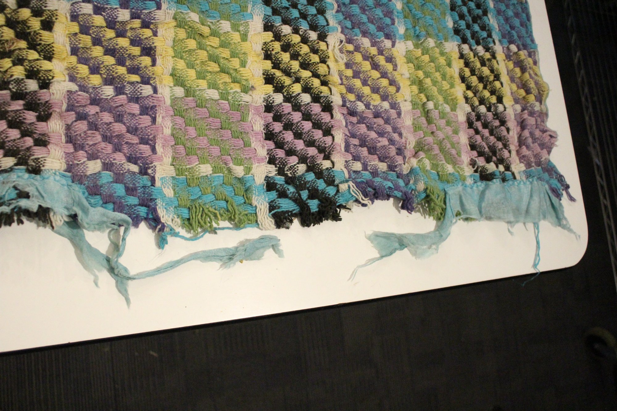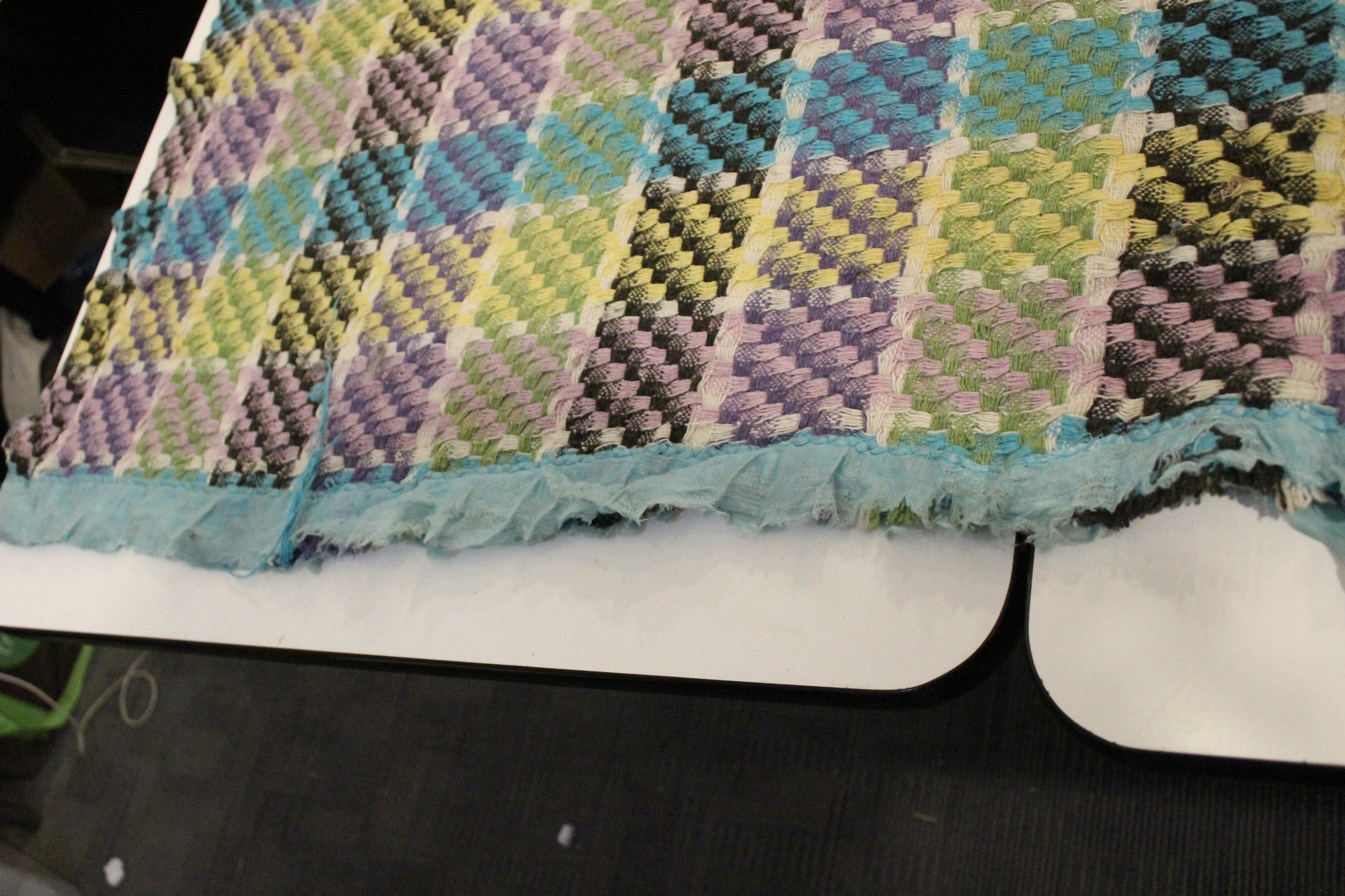 A large, green, blue, and purple, handmade plaid crochet blanket or afghan 76" x 58". damage along head and foot edges of blanket as pictured, with very minor damage in other places as pictured. This item can be shipped.