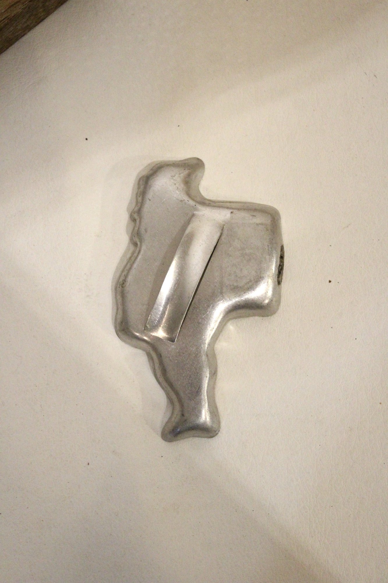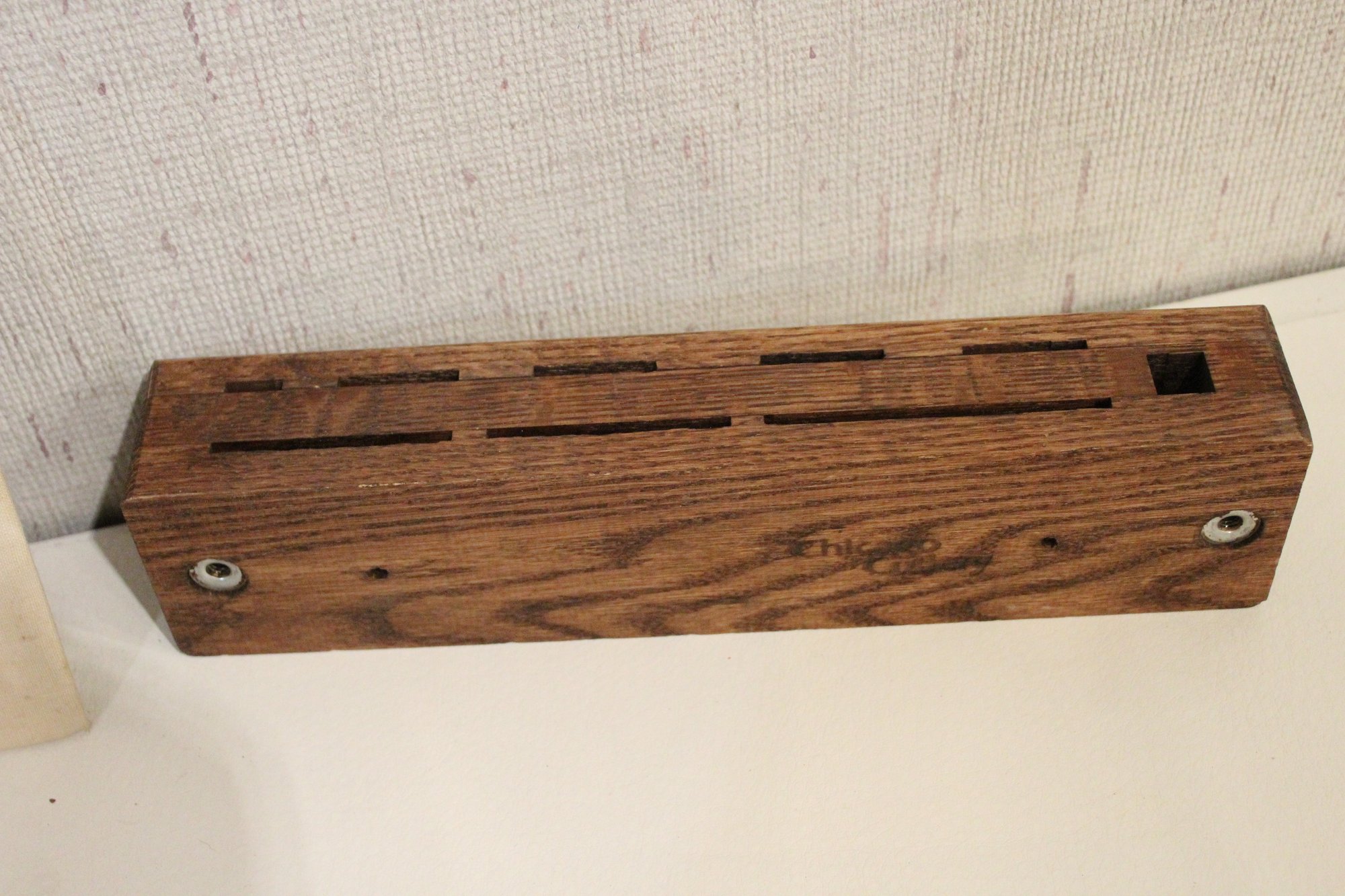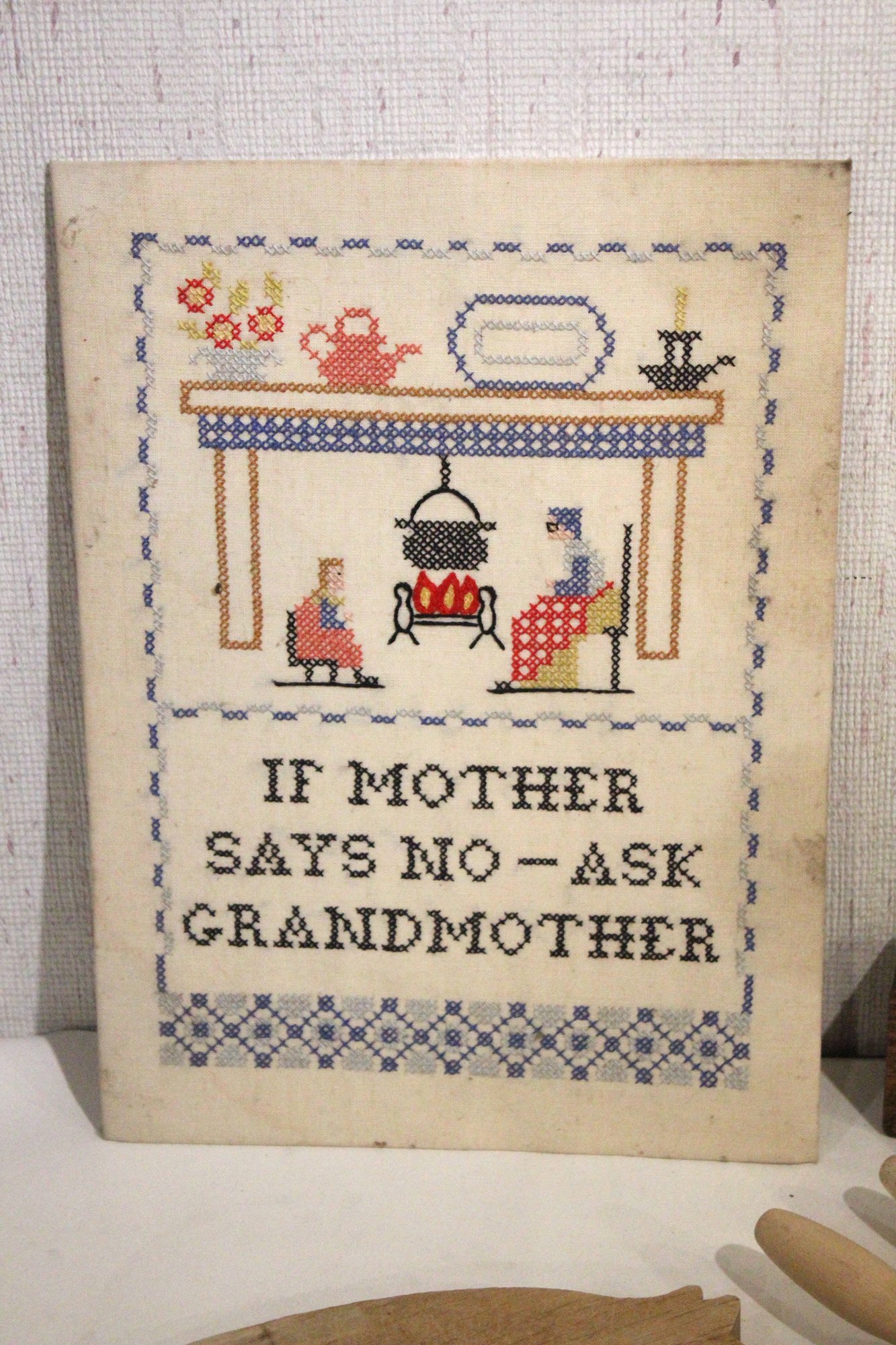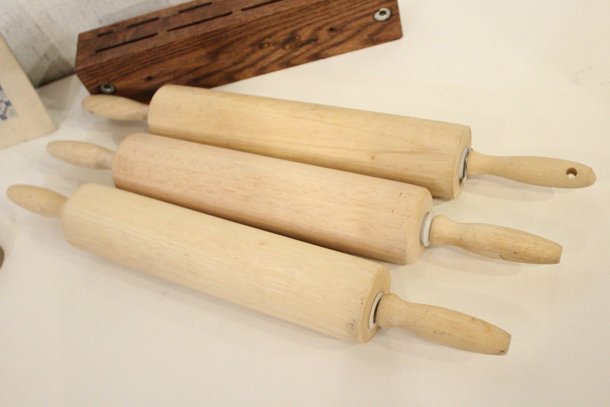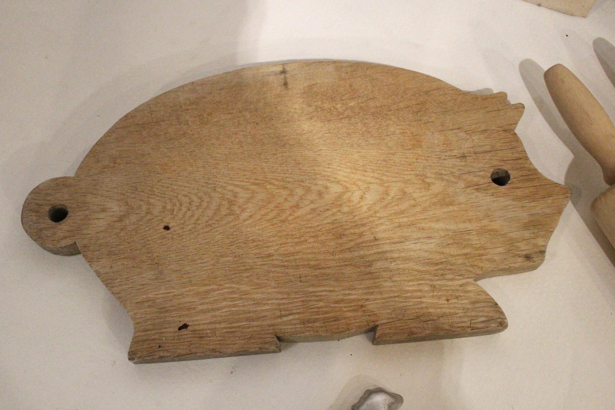 A vintage cross-stitch sampler 15" x 11", a vintage wooden pig-shaped cutting board 14" x 8", a vintage aluminum Santa Claus cookie cutter 3.5". 3 sturdy rolling pins 18" x3, and a Chicago Cutlery knife block holder 12" x 2" x 3". These items can be shipped.