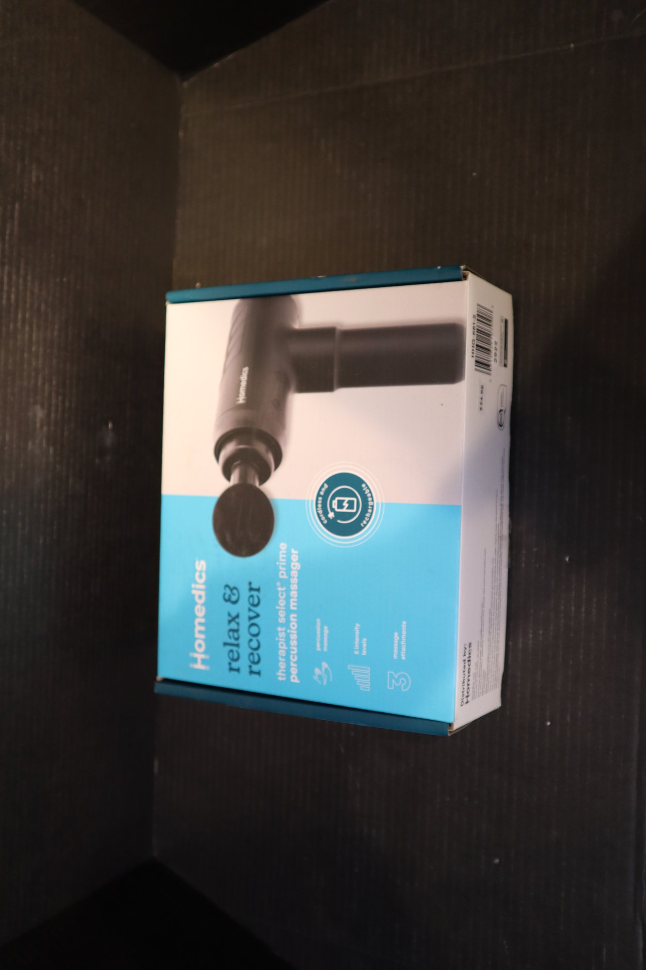 A cordless, rechargeable percussion massage gun made by Homedics. In excellent condition, in original packaging complete with all attachments, charging cable, and attachment bag.