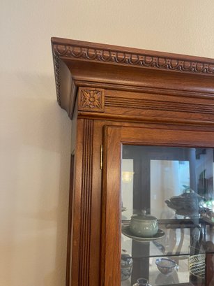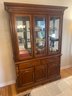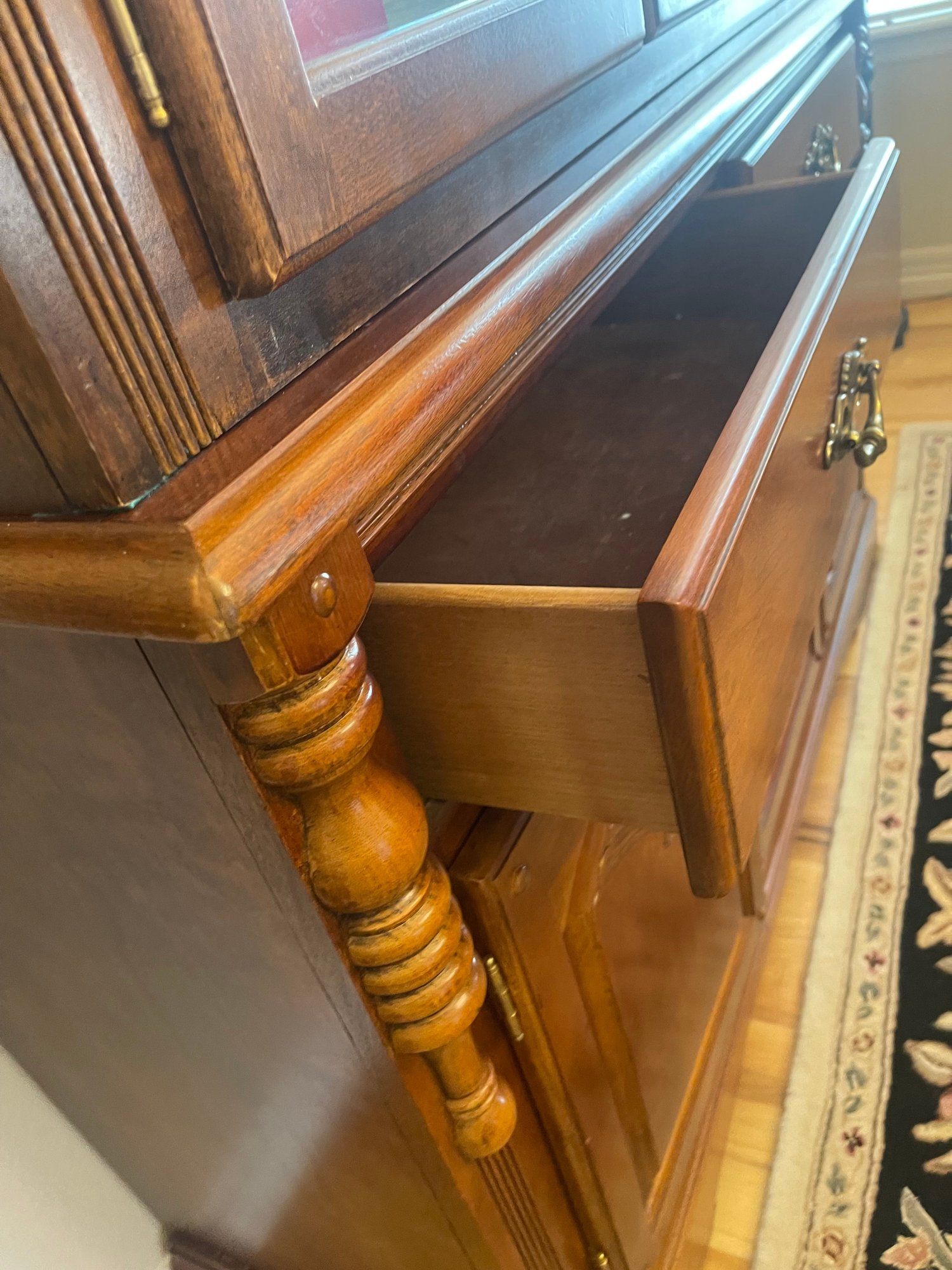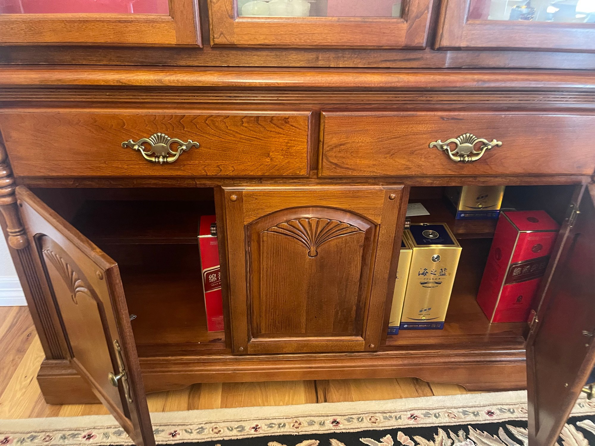 2 lights in top, 2 glass doors, 2 lower cabinets, 2 drawers. This is in good condition. 54 wide, 15.5 deep, 82 high. It is in 2 pieces to allow for transport.
