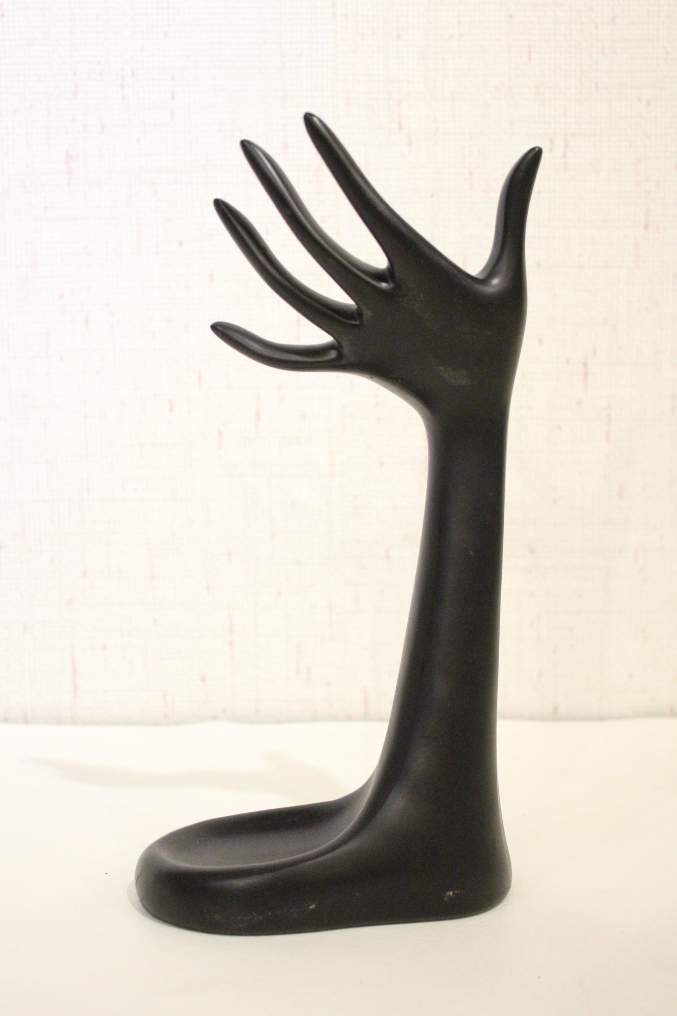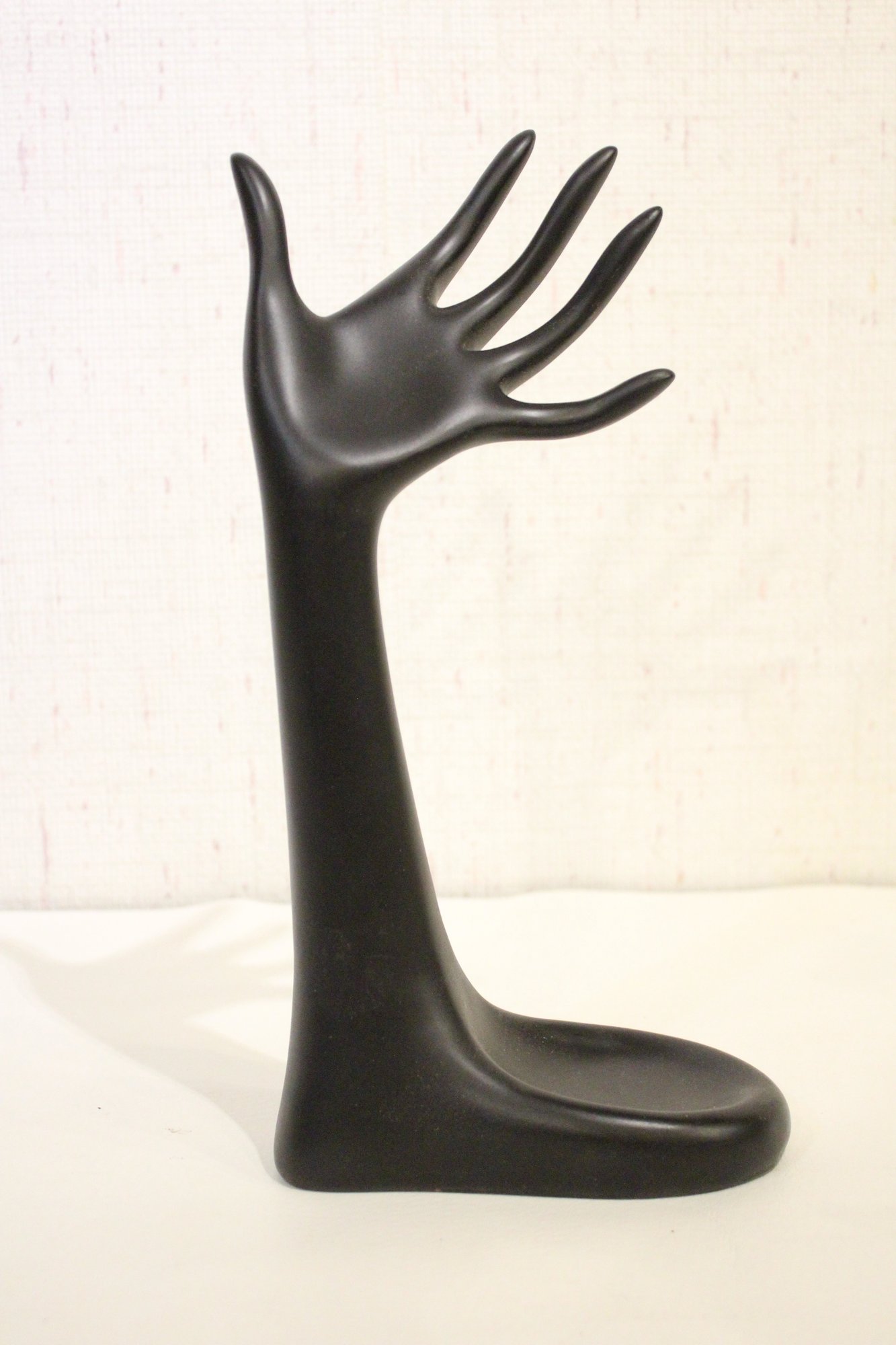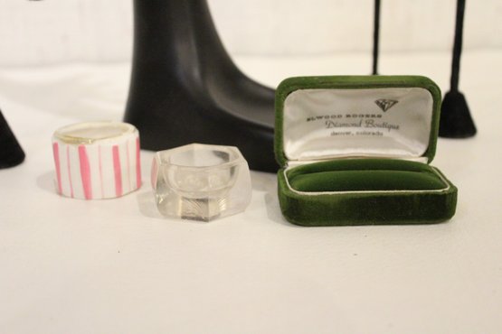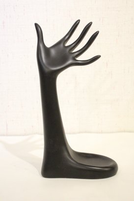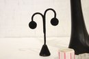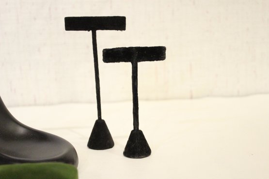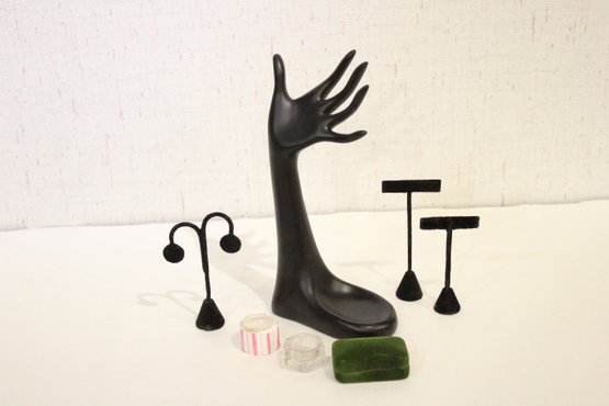 A 5" tall earring display, a black resin mannequin hand jewelry display holder 12", and 2 additional earring displays at 6" tall, and 4" tall. Additionally 2 small 1" jars and green jewelry box. These items can be shipped.