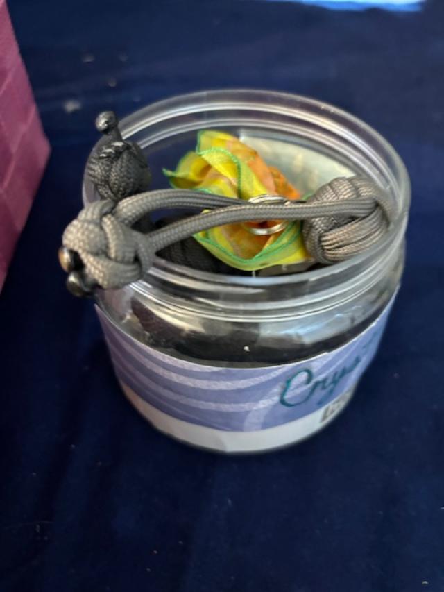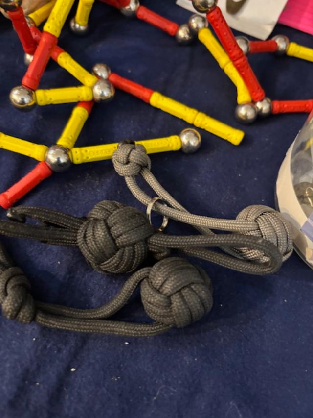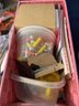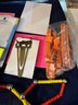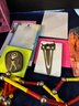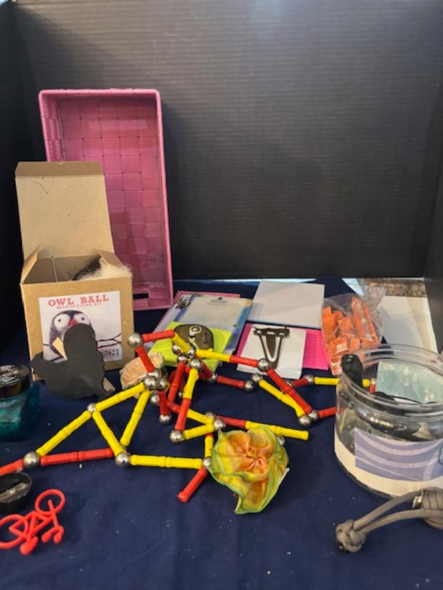 Pink basket filled with fun stuff, note pads, ornate book marker and a fuzzy owl kit and other little fun things, a container with a plastic and magnet link rope, painted paper weight.