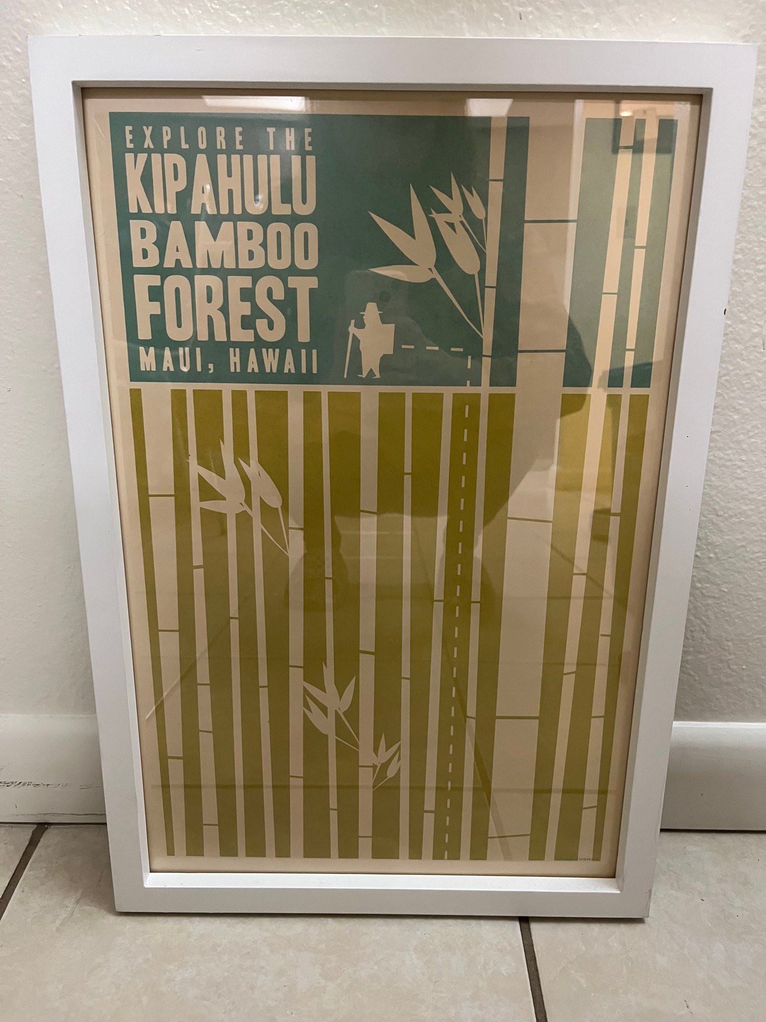 A contemporary, travel advertisement style, art print of the Kipahulu Bamboo Forrest in Maui, Hawaii. The frame Target, Thresh Hold, white painted wood 12" x 18". This item can be shipped.