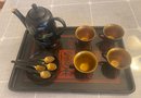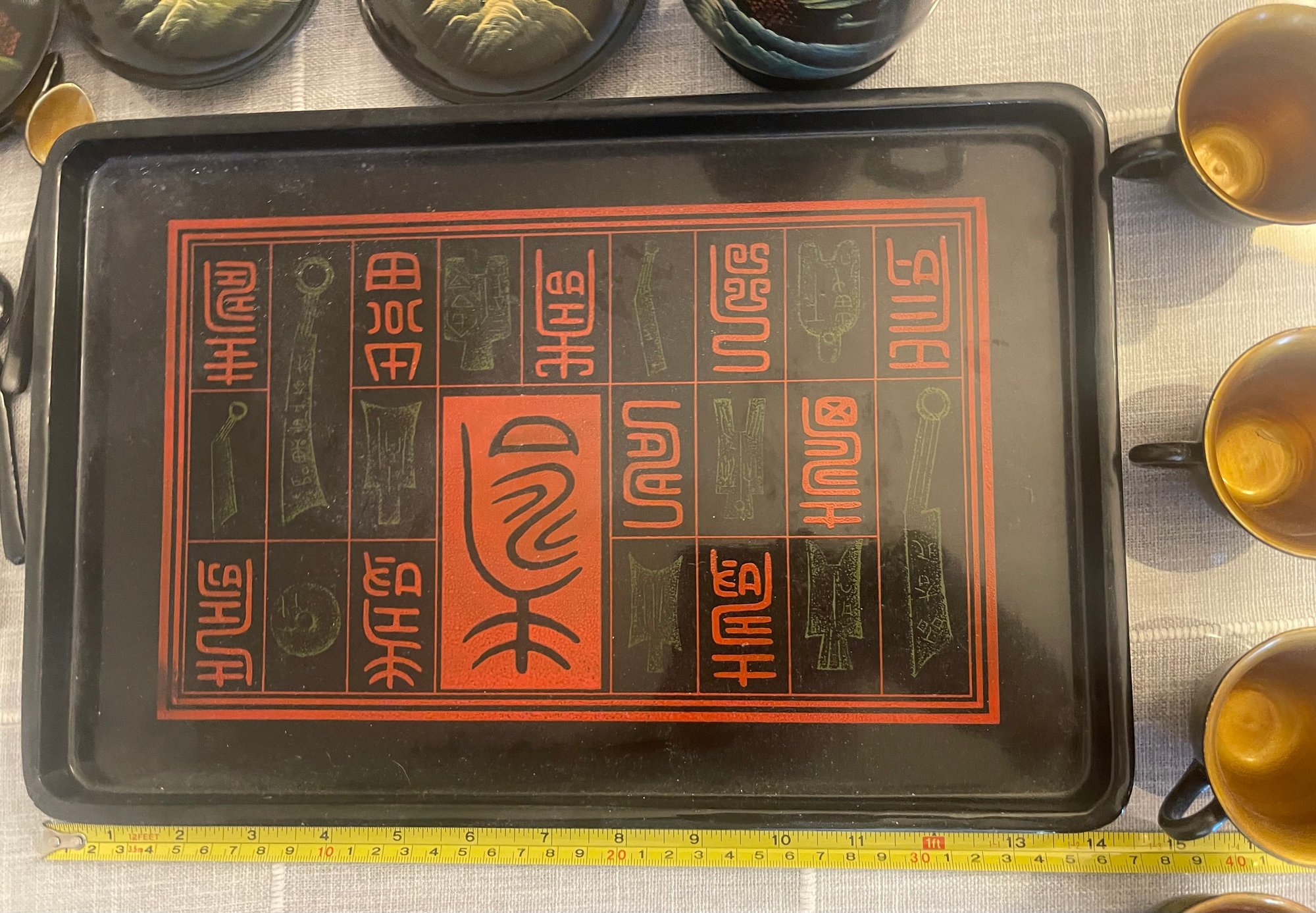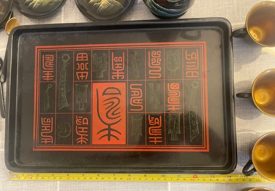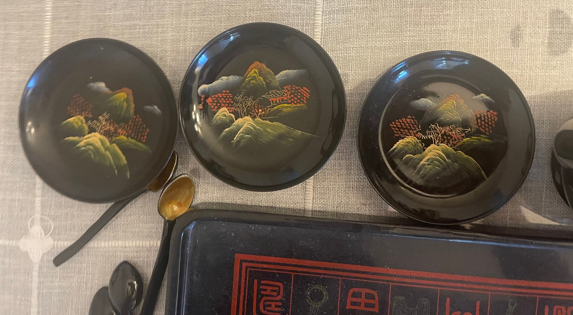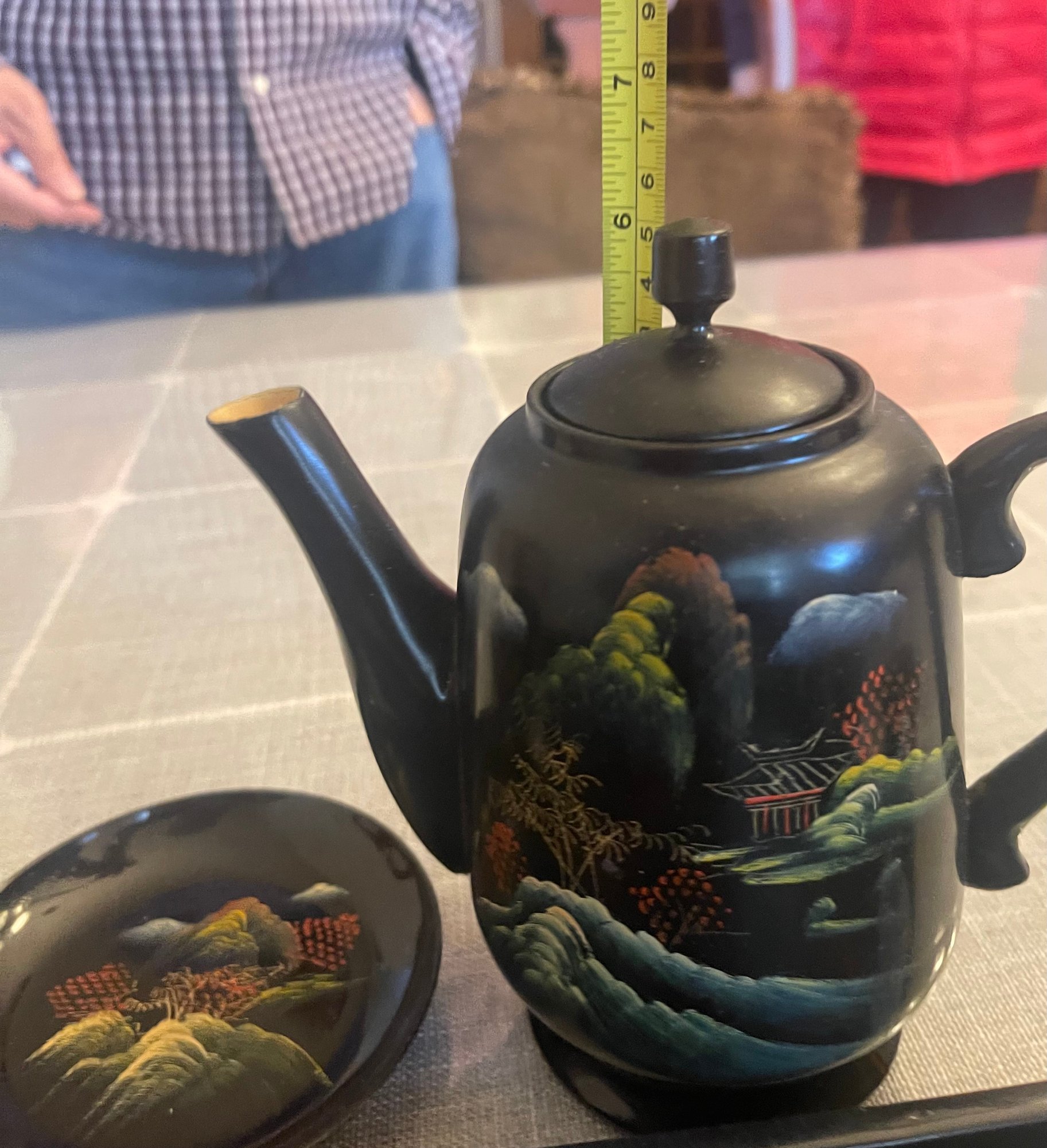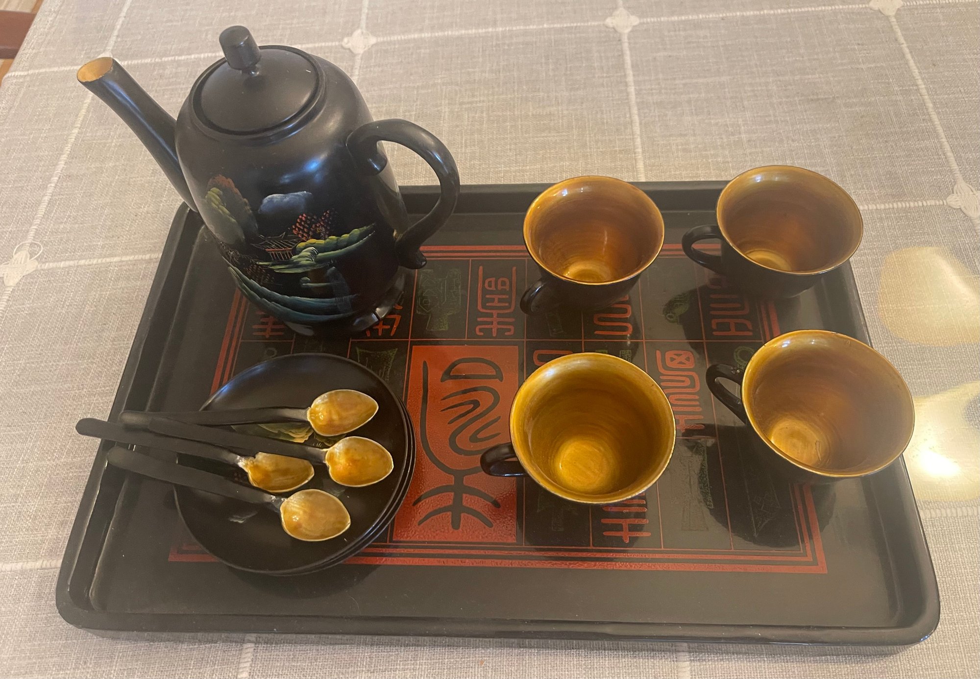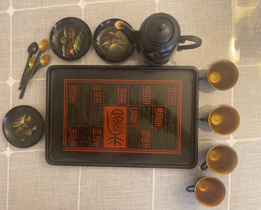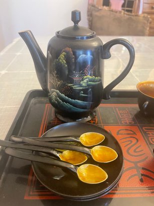 clay mold laquerware set, light weight wood. 4 cup, 3 saucers, tray teapot and 4 spoons. This can be shipped
