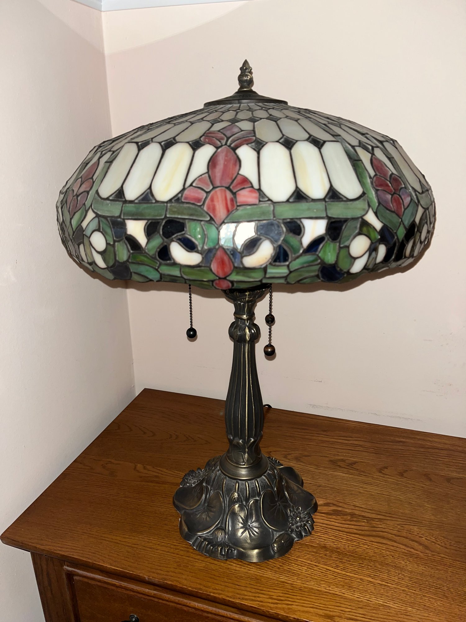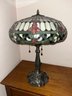 Beautiful, large Tiffany Style lamp, heavy brass with lovely leaf and flower base. Holds 3 bulbs.
