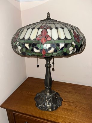 Beautiful, large Tiffany Style lamp, heavy brass stem with lovely leaf and flower base. Holds 3 bulbs.