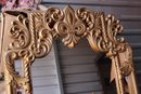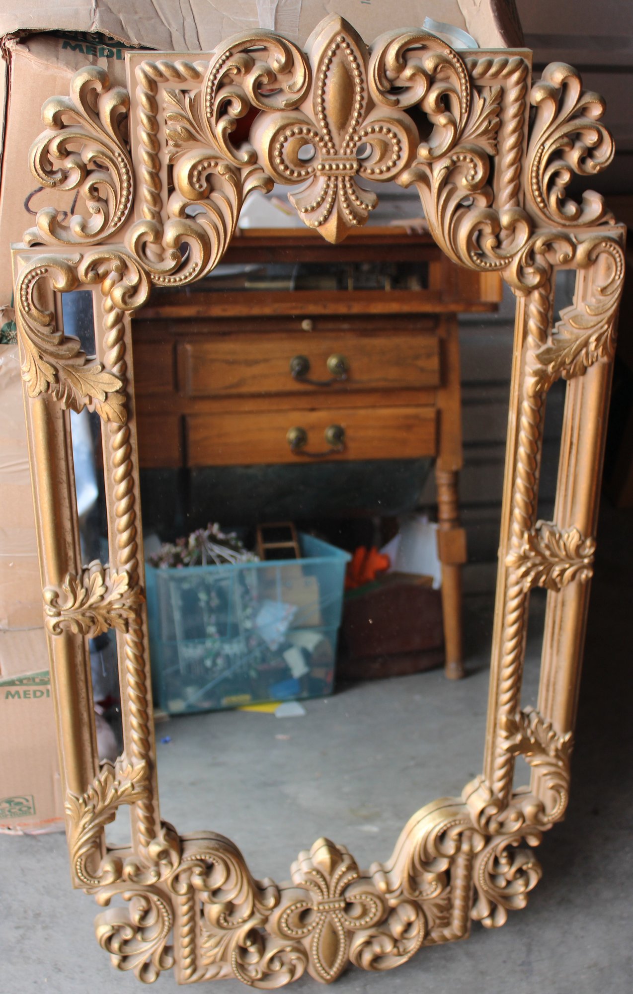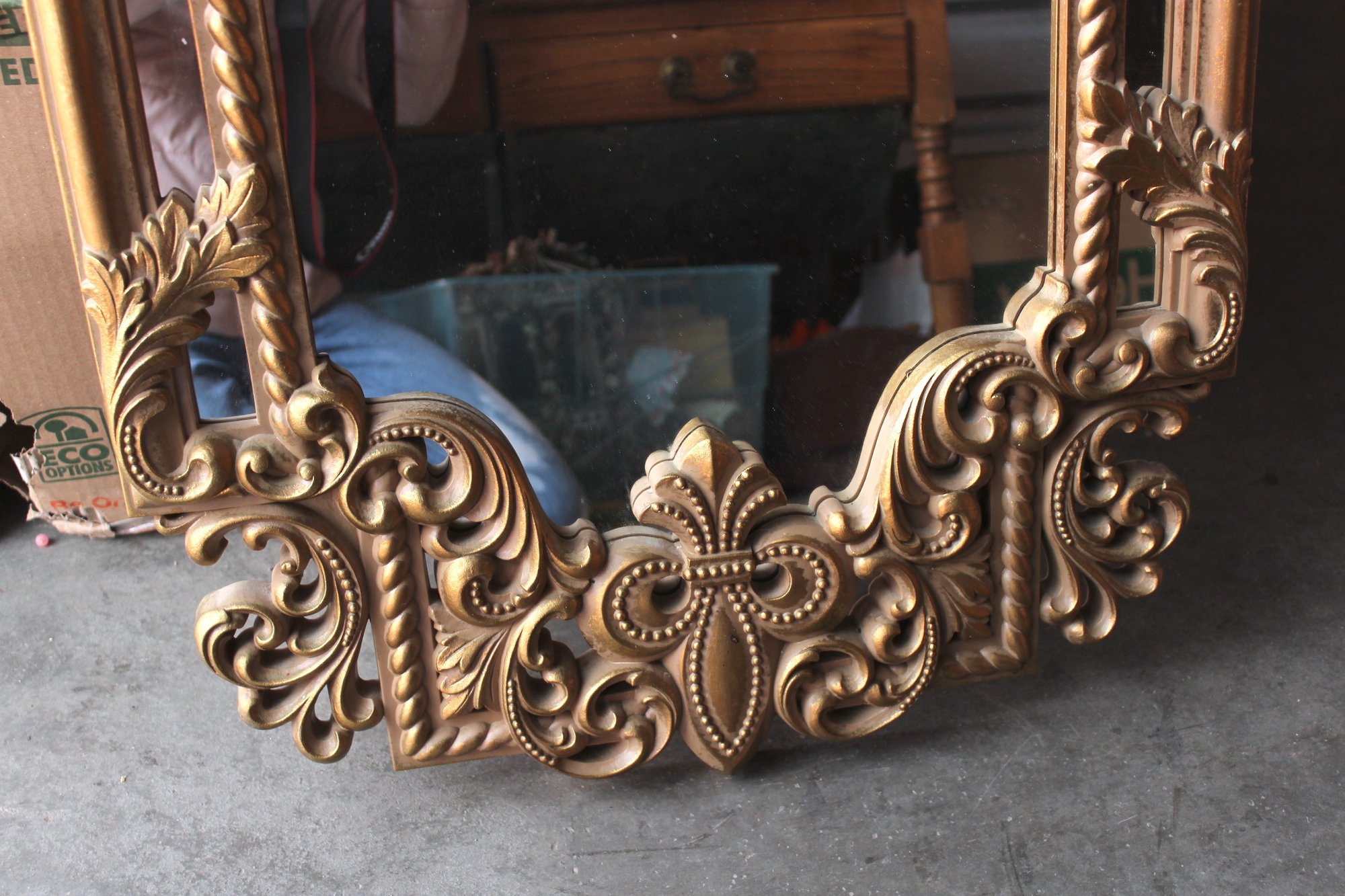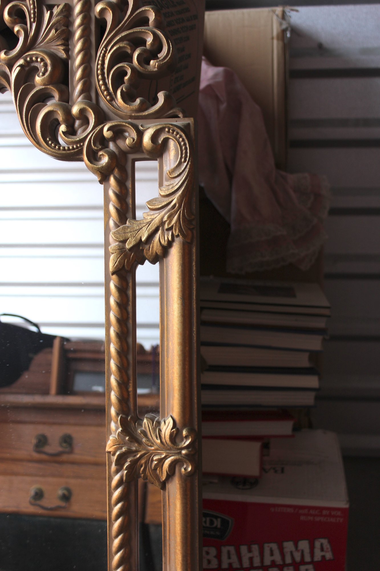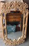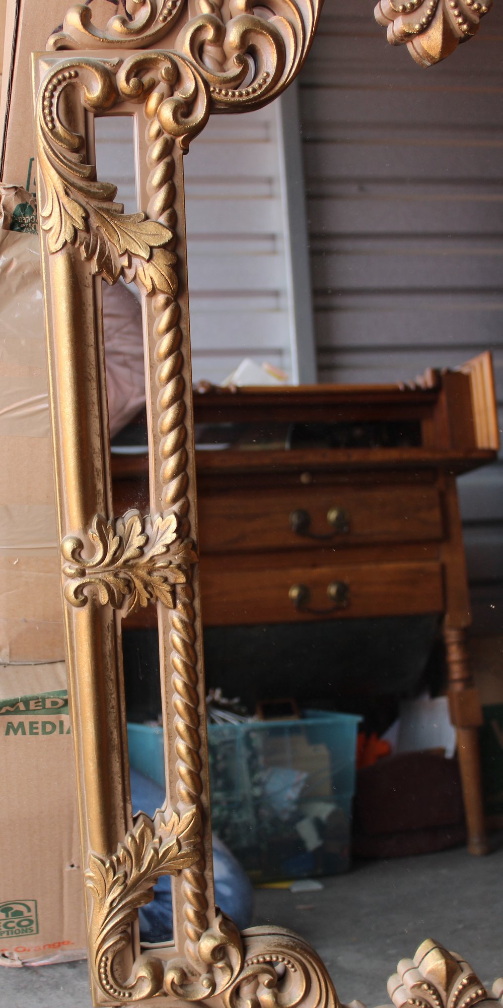 A large gold toned Rococo style or Hollywood Regency style decorative mirror, 42" x 22". This item can not be shipped.