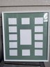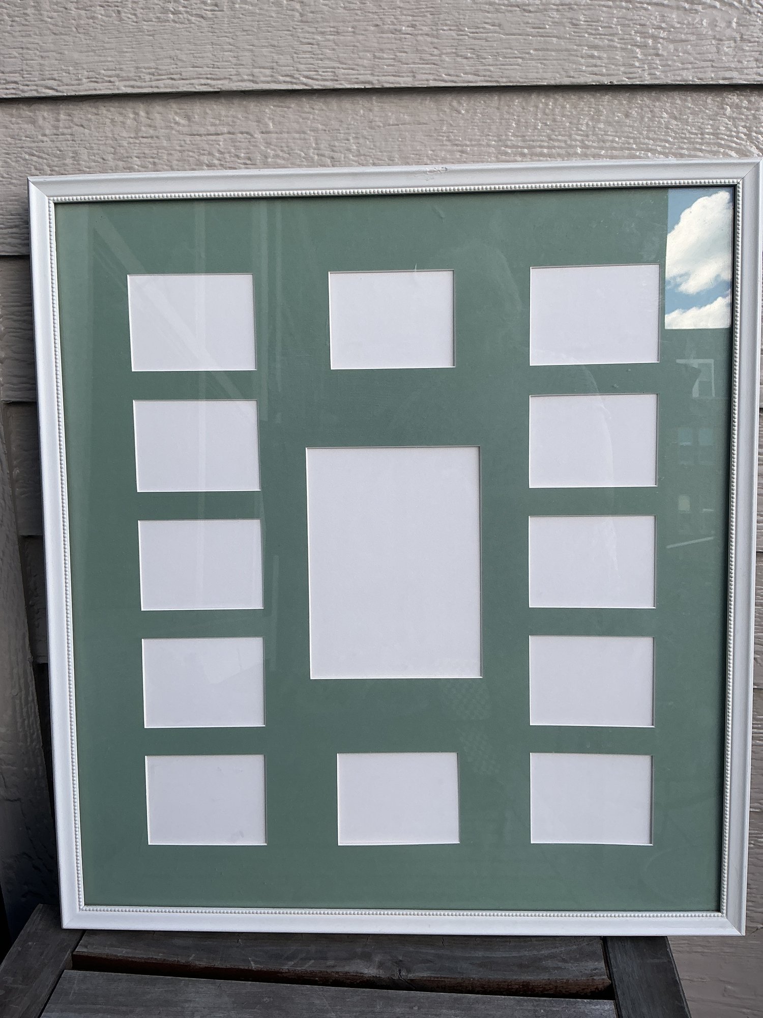 Large white picture frame with a light dusty green mat to mount your family or vacation pictures. Beaded edge on frame with easy to get to back. The sky in corner is just a reflection of lovely day here. The glass is plexiglass. The frame is 24 wide x 25 high and there are 13 spaces for pictures.