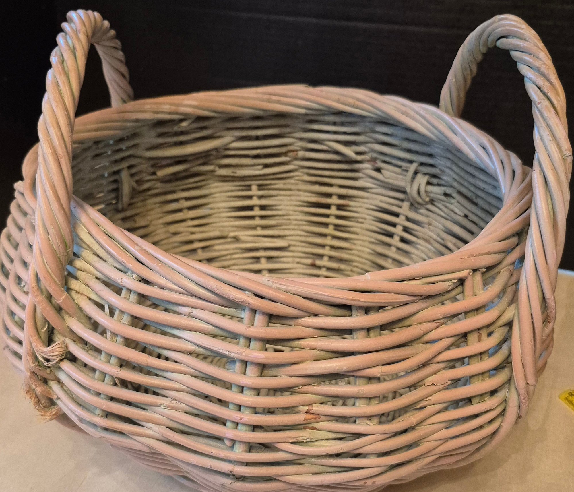 A large weaved basket. Measures 43" around the middle, 7" tall - 11" with handles . The base is 9 " round and 7.5" deep.