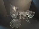 Glass Pitcher , Small Saucer And 7 Wine Glasses