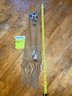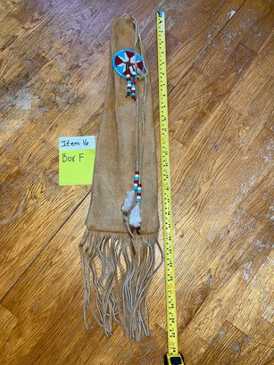Leather bag with leather fringe. Red, white, and blue beaded rosette; and beads and feathers on closing strap. Pipe bag, possibly Plains Indian