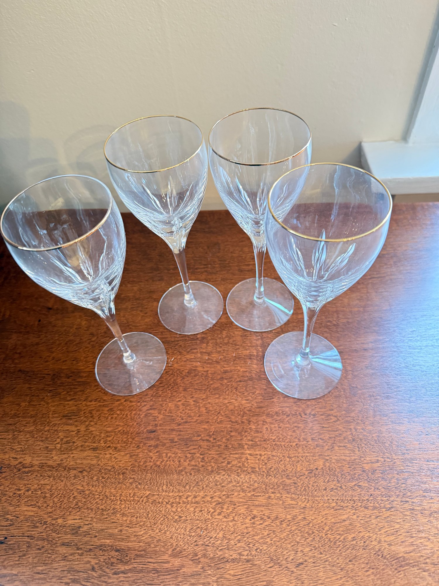 Four Lennox firelight gold rim wine glasses with vertical cut glass. Were produced between 1987 and 2010. Approximately 7 7/8 tall. In great condition - no chips or cracks.