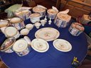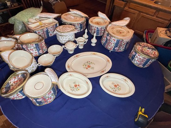 15 large dinner plates, 16 salad plates,16 bread plates, 16 cups and saucers, 8 cereal bowls, 16 soup bowls, 16 dessert bowls. 2 footed, double-handled soup bowls, cream and sugars, salt and pepper,1 serving platter, and 2 serving bowls. All are Lenox Temple Blossom except the 16 soup bowls, which are complimentary Lenox Temple Citation Gold.