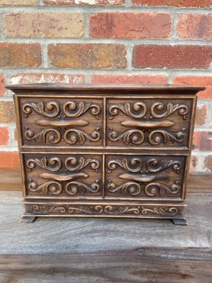 Popular in the mid 70s - plastic with a faux wood look and velvet lined drawers . Often used as a jewelry box.
