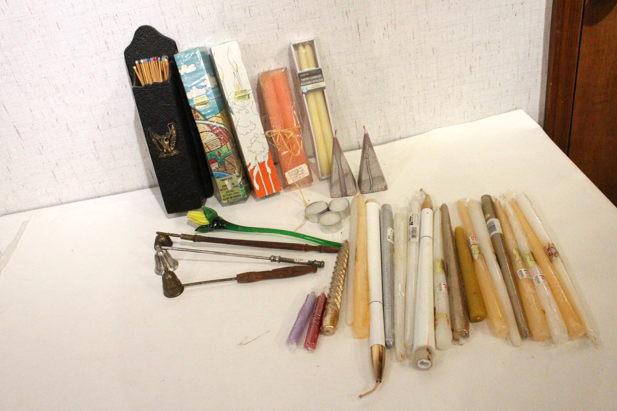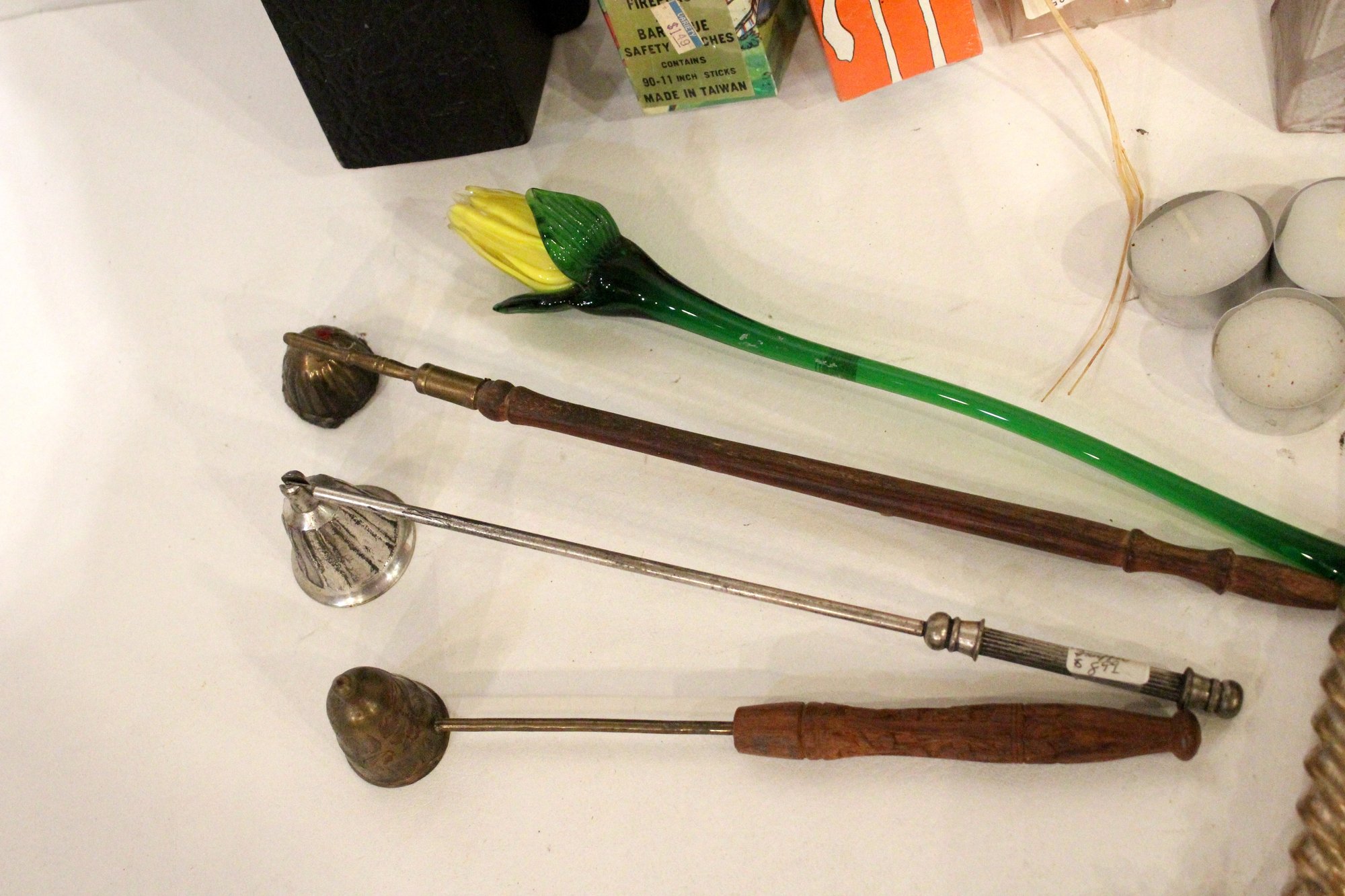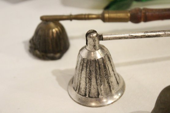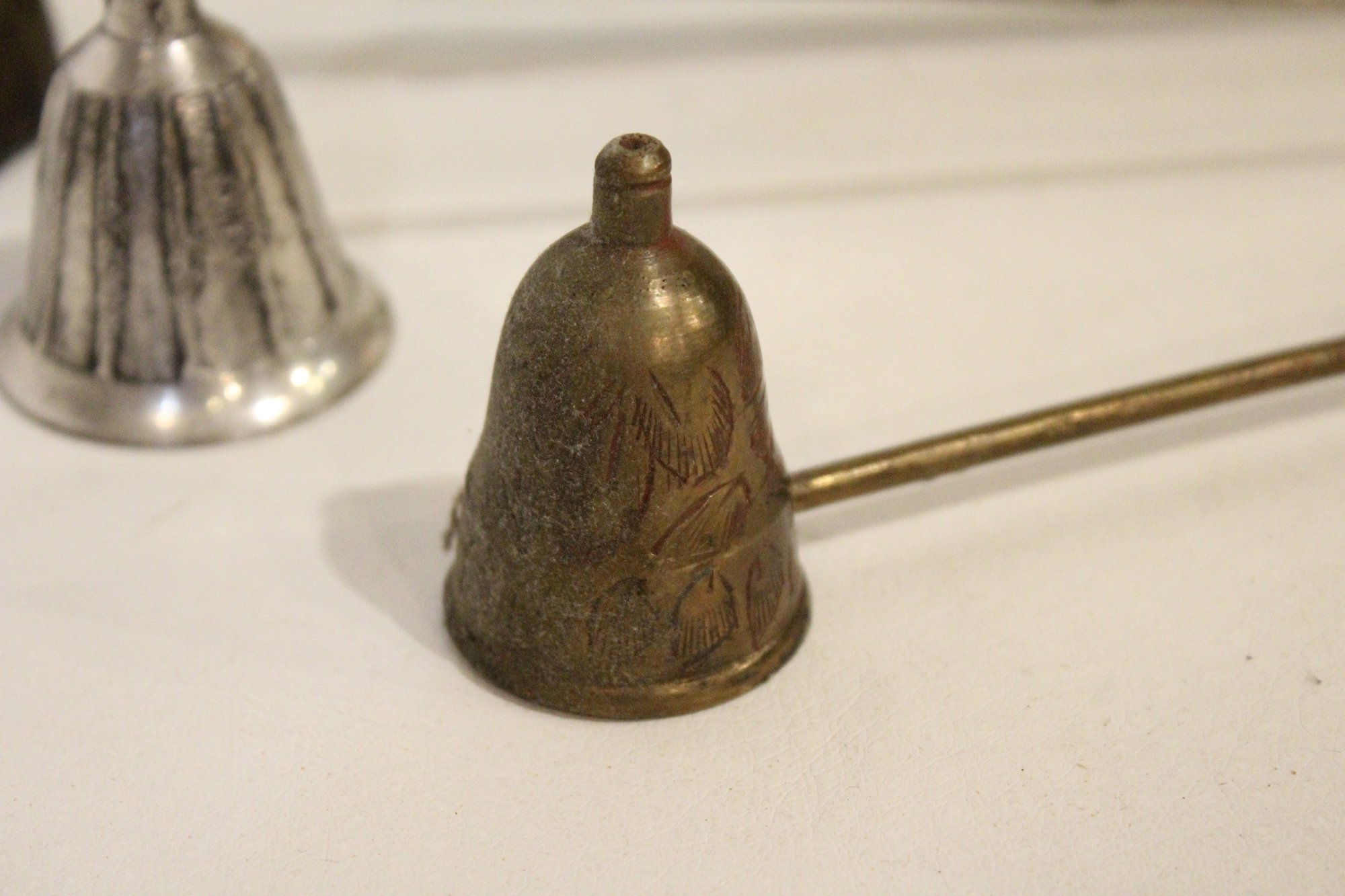 3 candle snuffers; vintage brass candle snuffer with etched details, a vintage silver toned candle snuffer, and a vintage brass candle snuffer,
