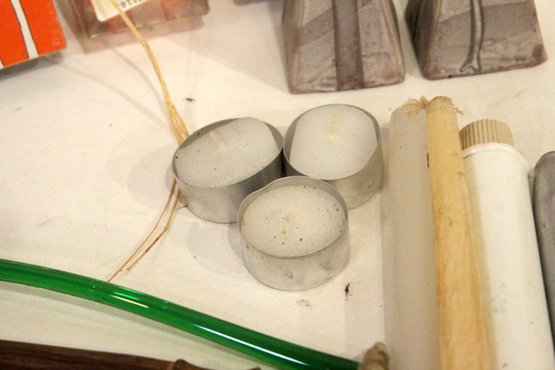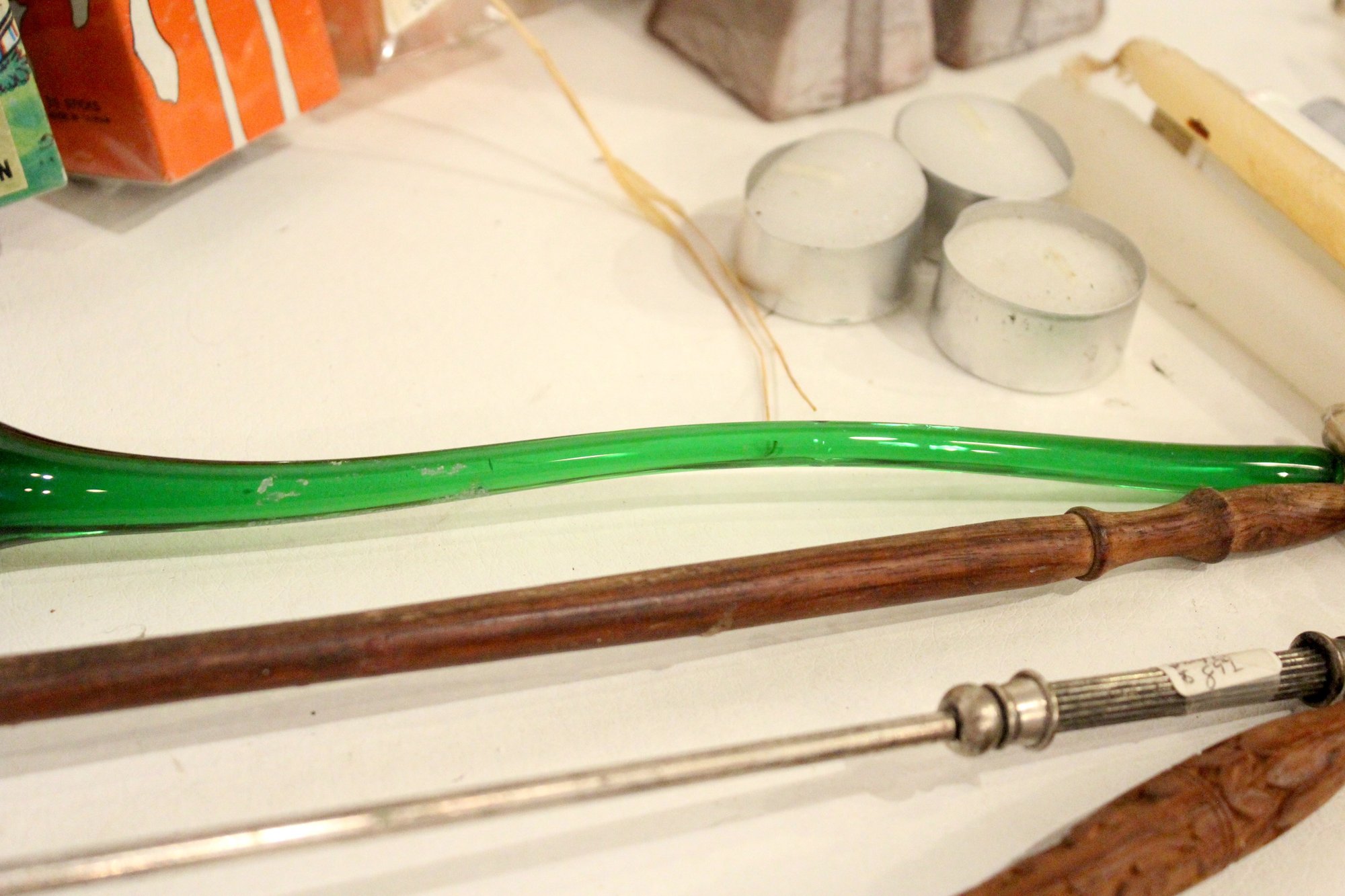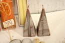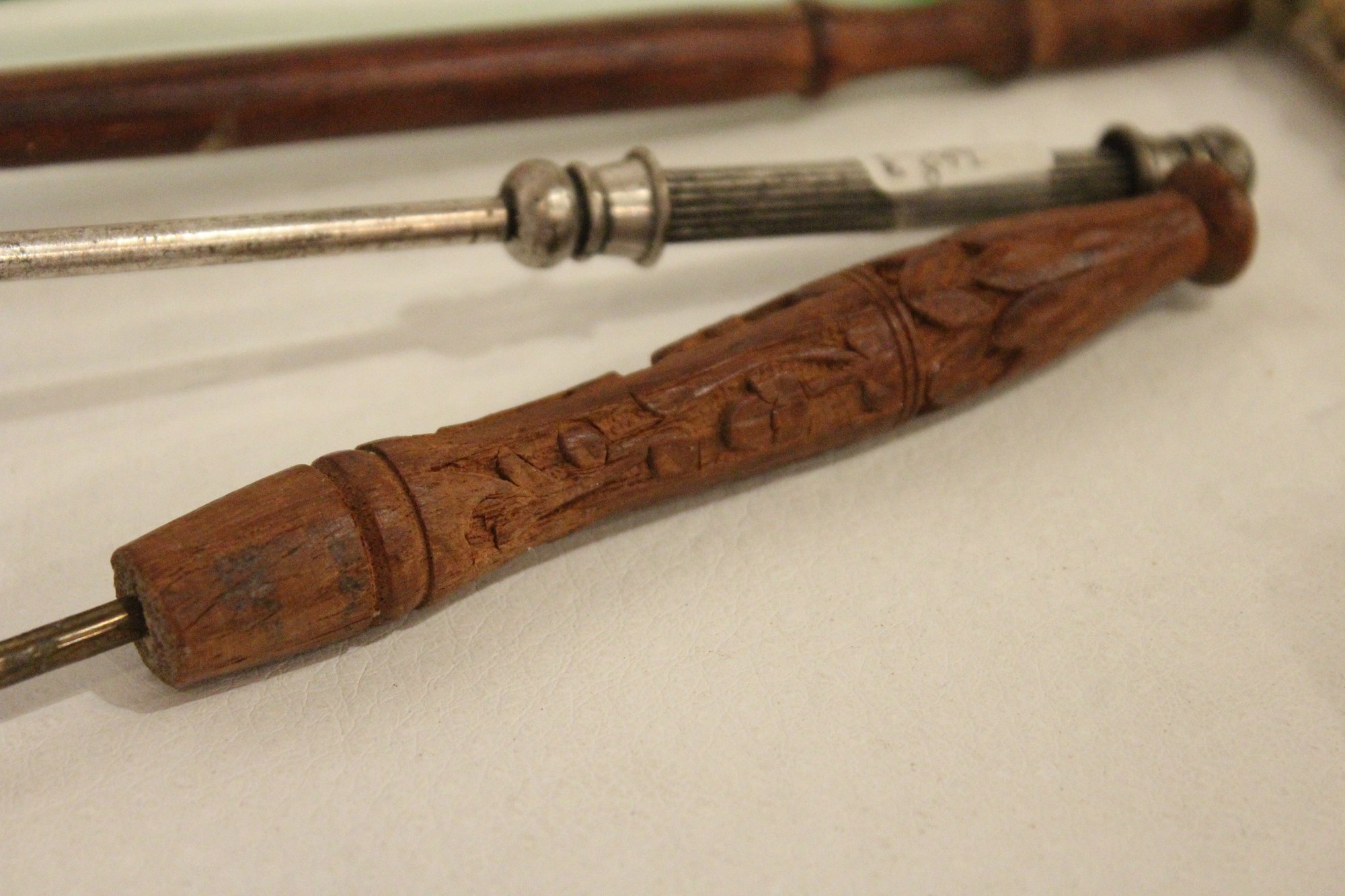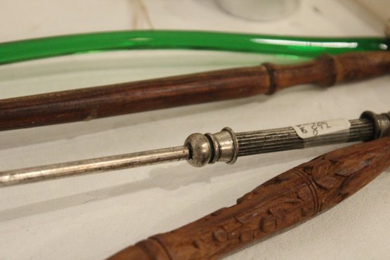 3 candle snuffers; vintage brass candle snuffer with etched details, a vintage silver toned candle snuffer, and a vintage brass candle snuffer,