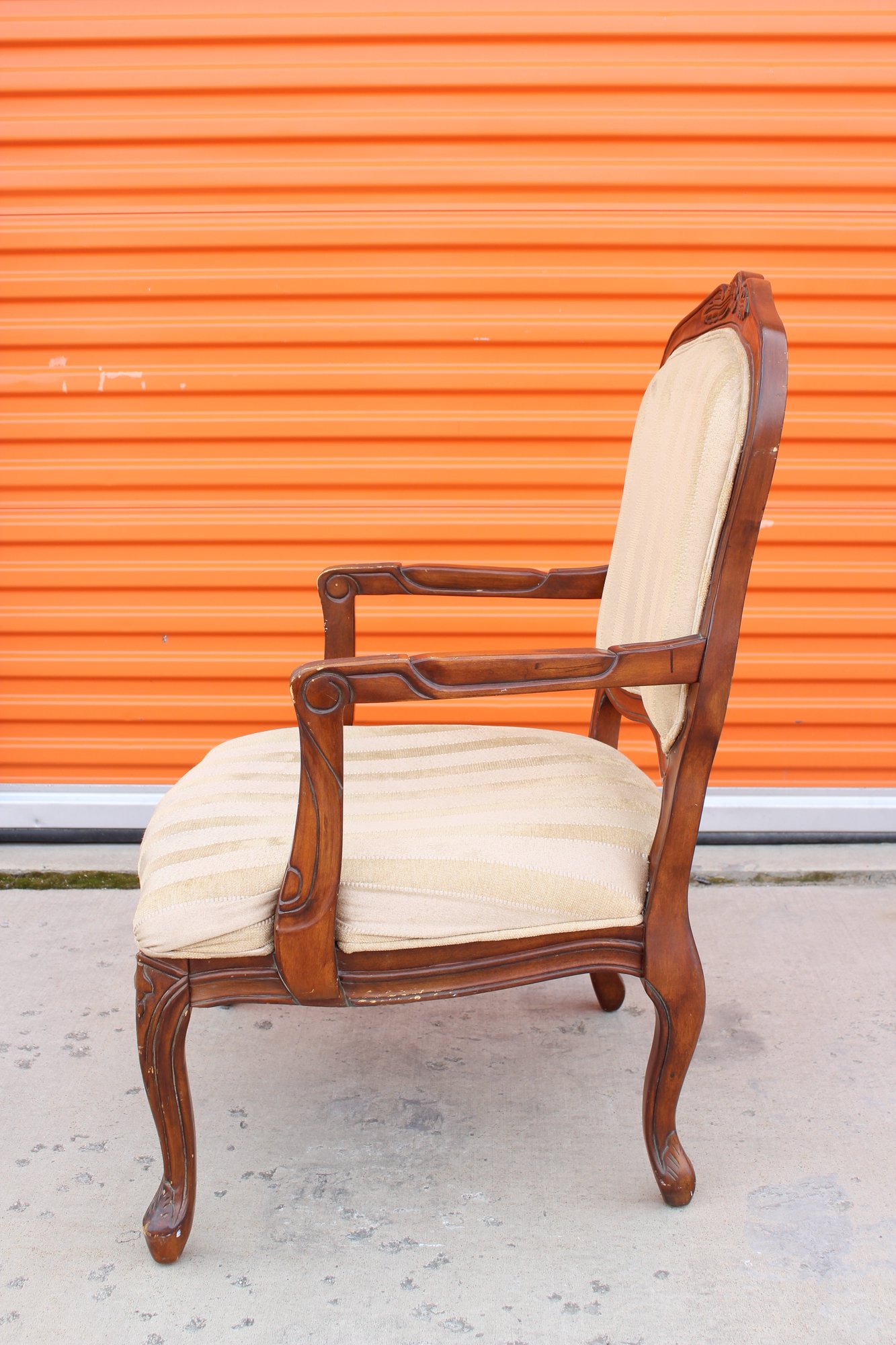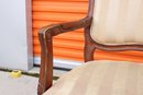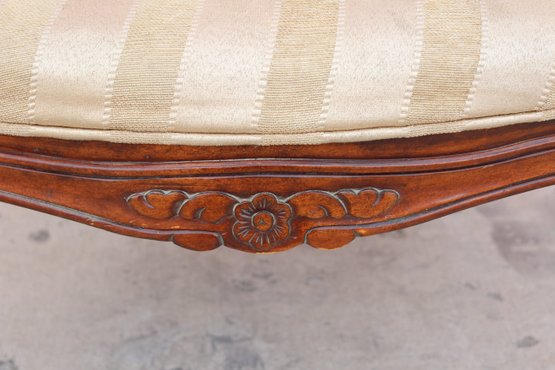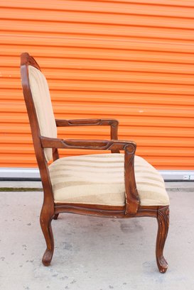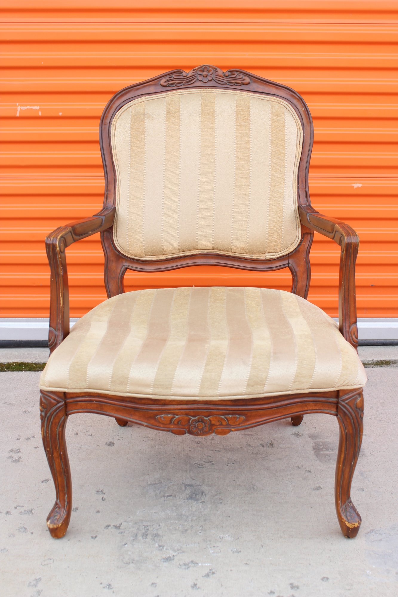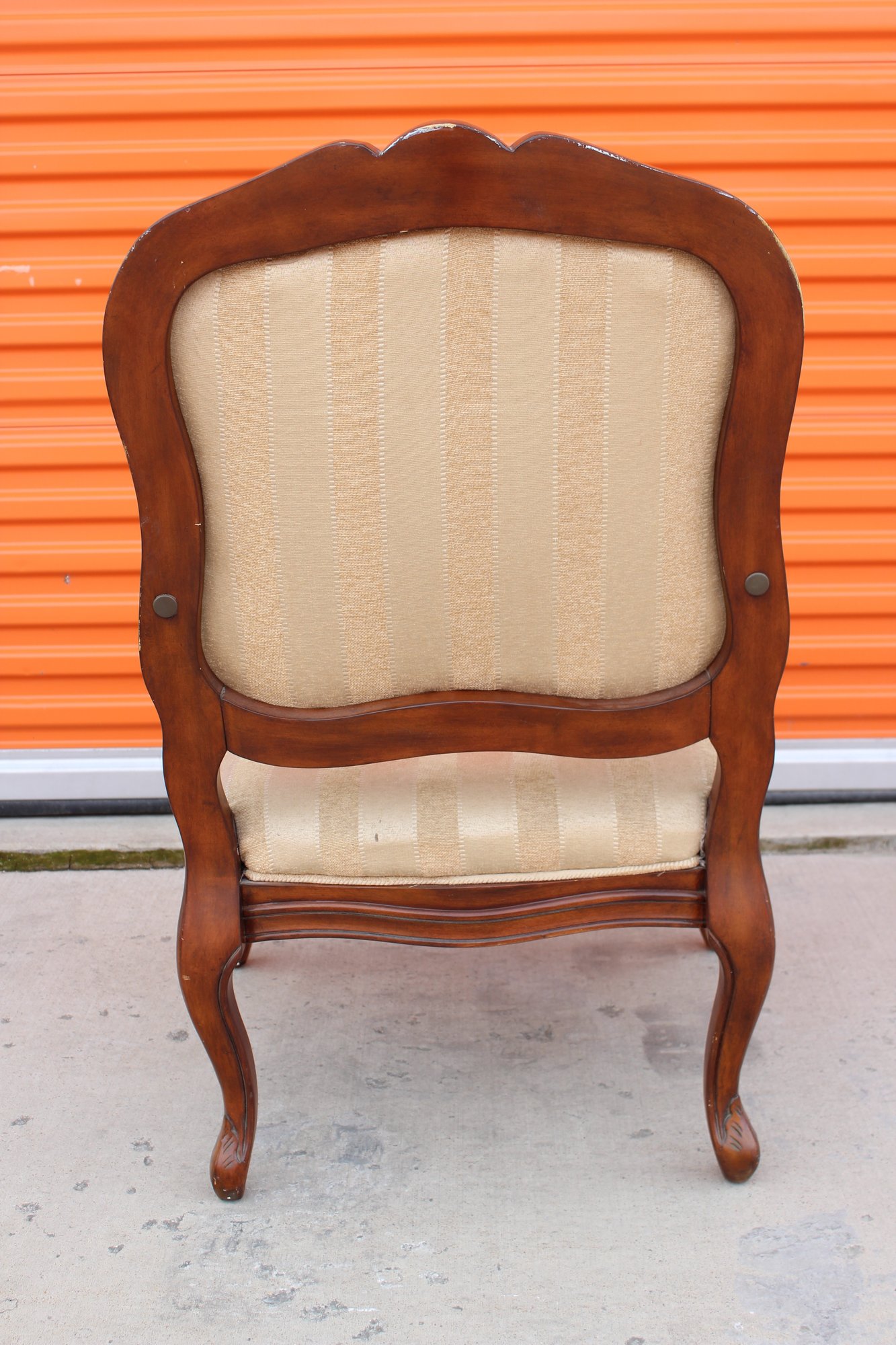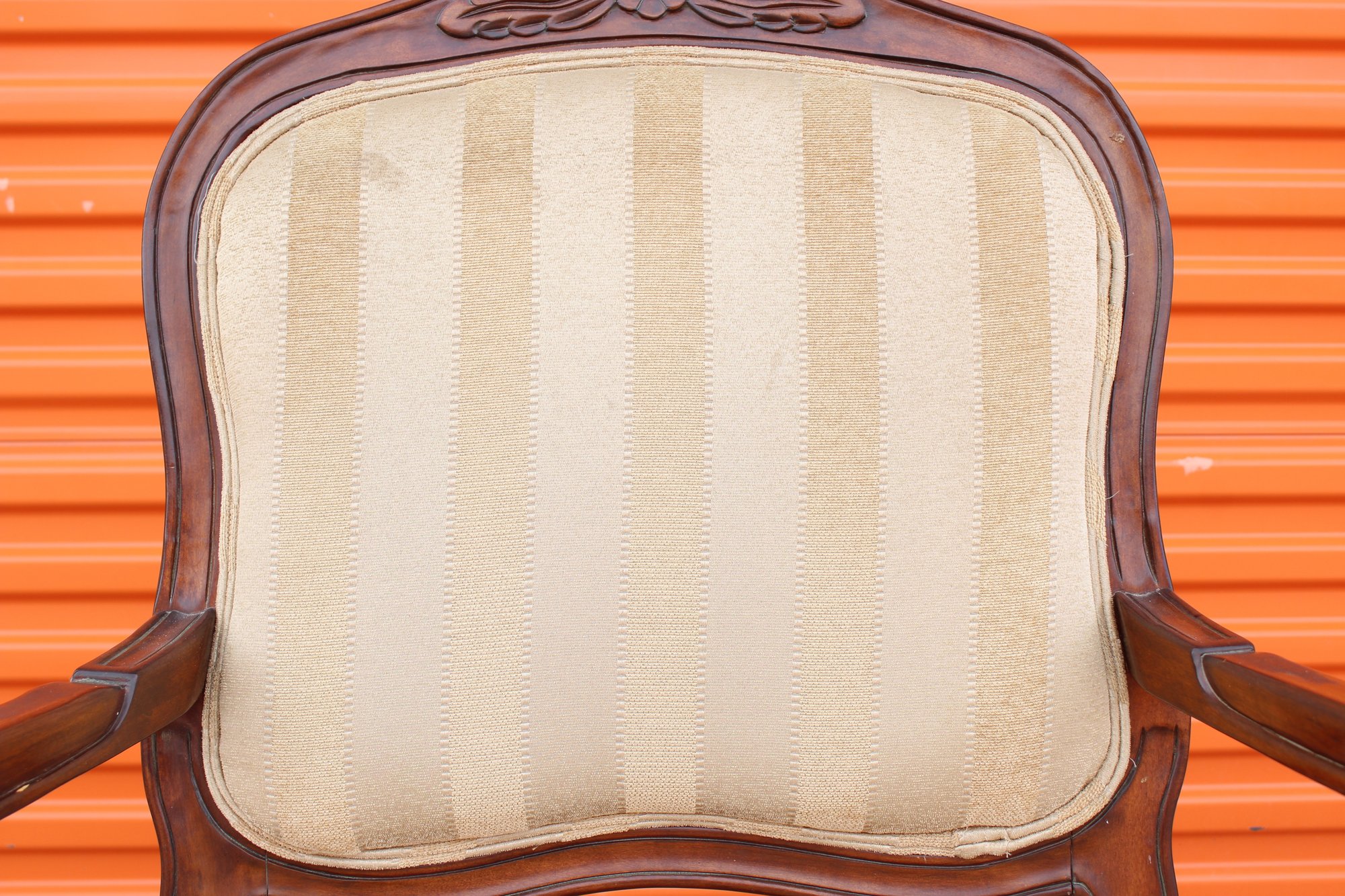 Louis XV-style, French upholstered open armchair with a walnut-stained beech frame and striped fabric upholstery, 39" x 26" x 25". This item can not be shipped.