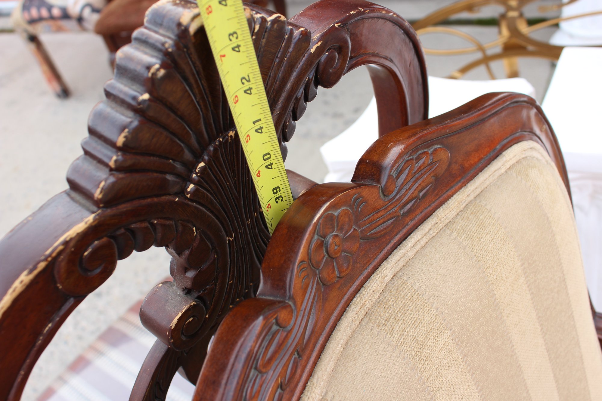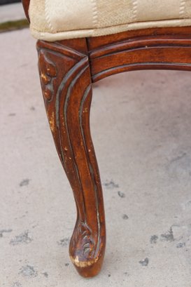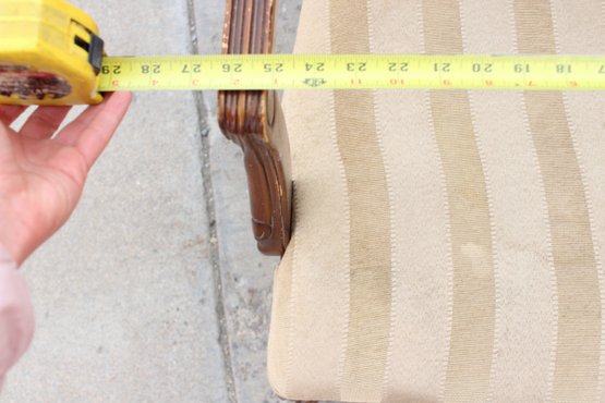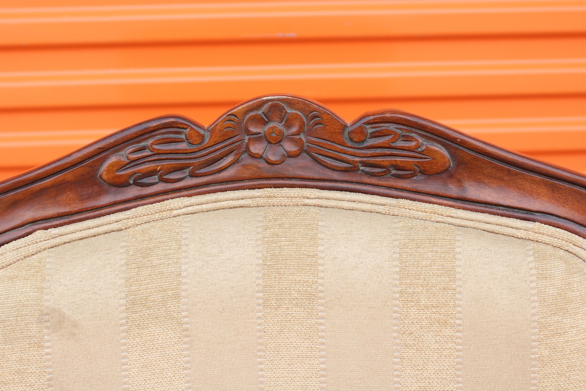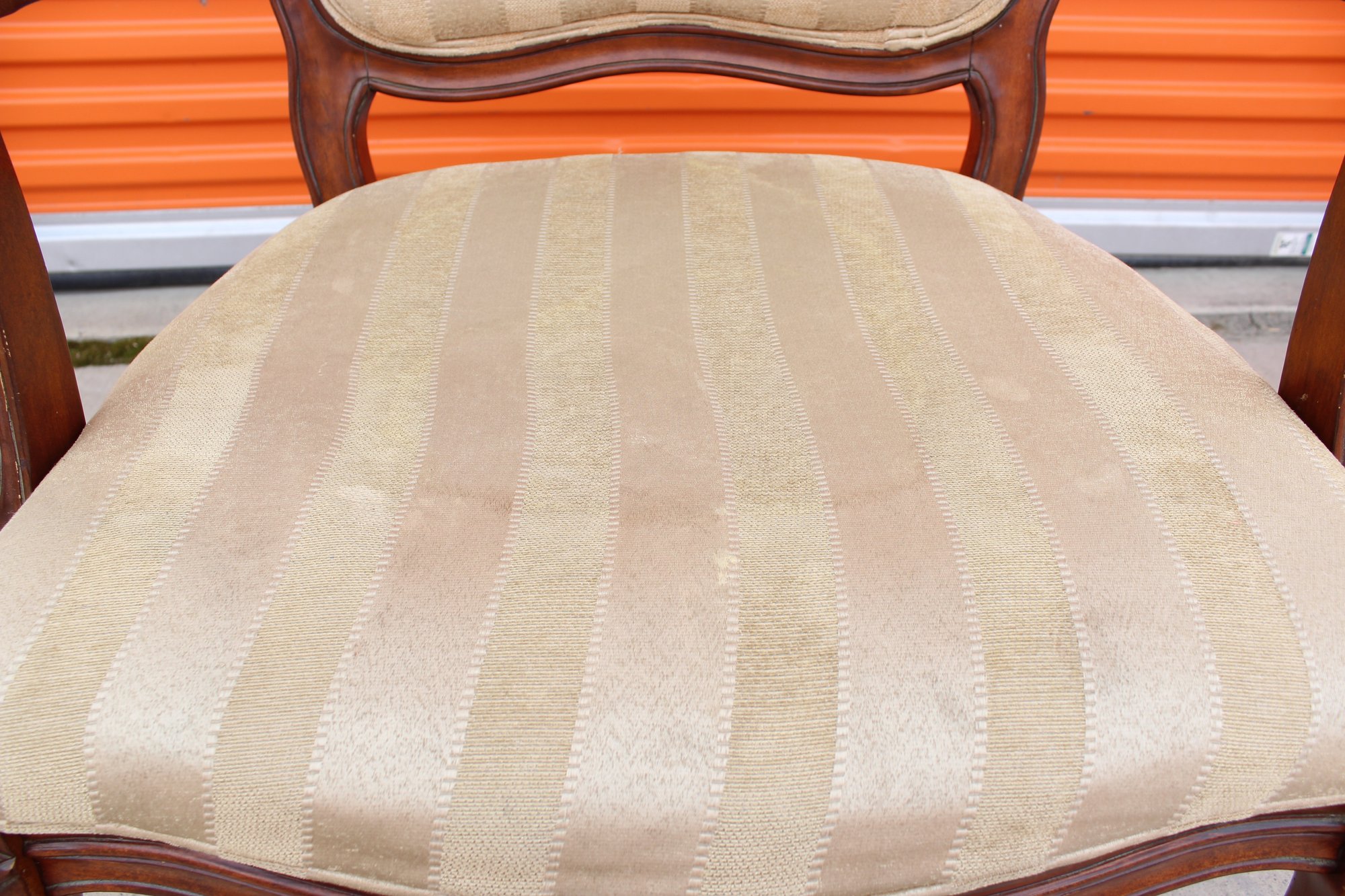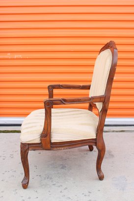 Louis XV-style, French upholstered open armchair with a walnut-stained beech frame and striped fabric upholstery, 39" x 26" x 25". This item can not be shipped.