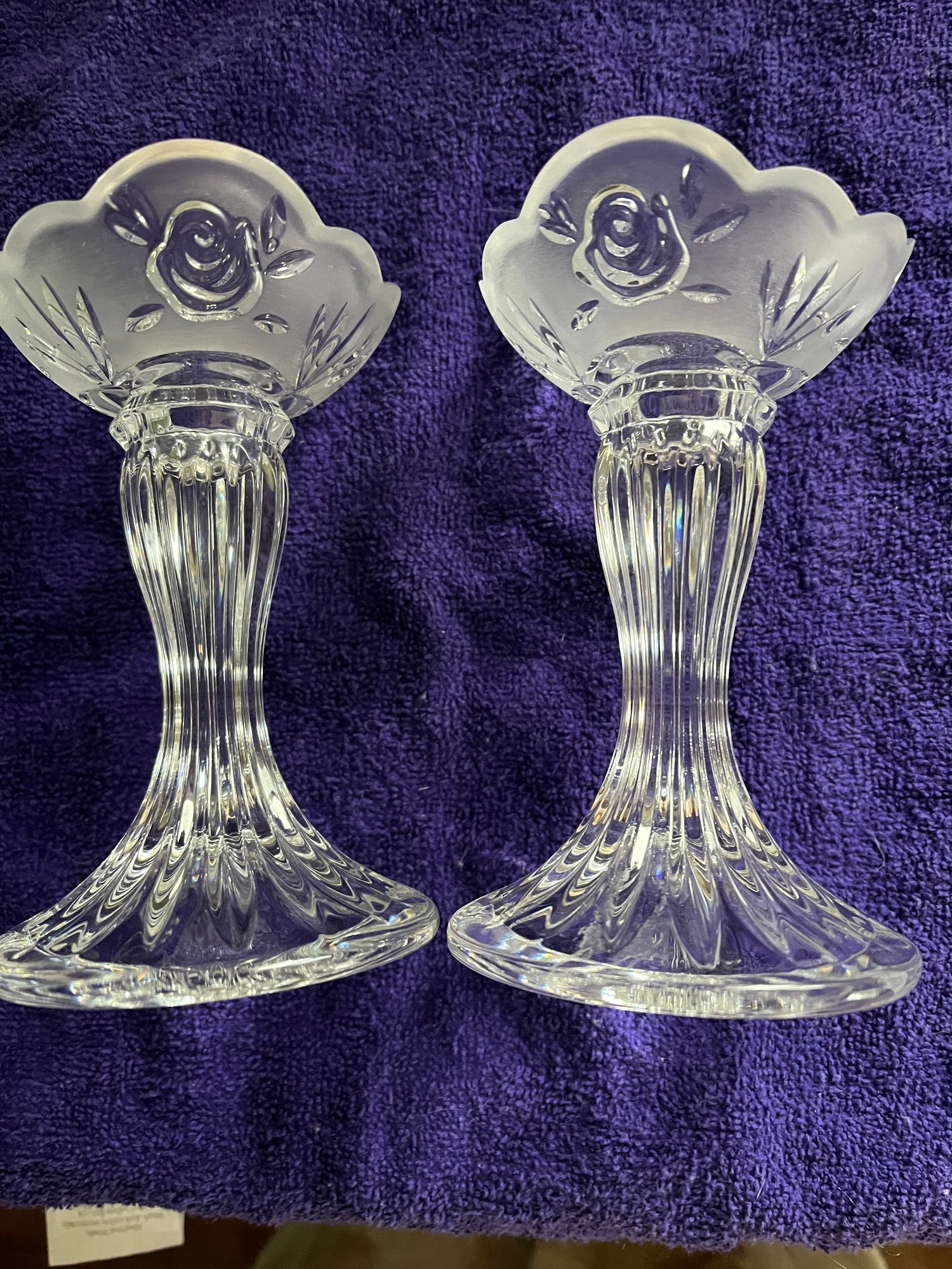 Frosted etched top with sturdy cut base. Fits 1” wide tapers.