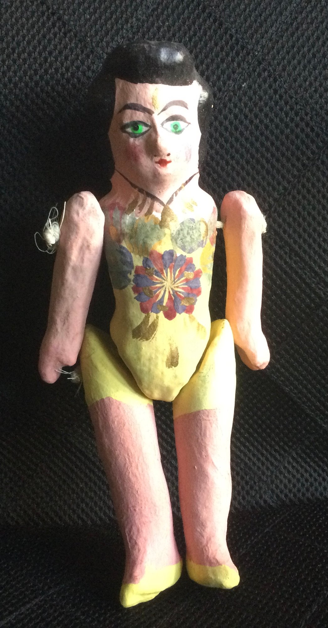 9 1/2” Mexican hand painted paper mache Lupita folk art doll, jointed and tied.