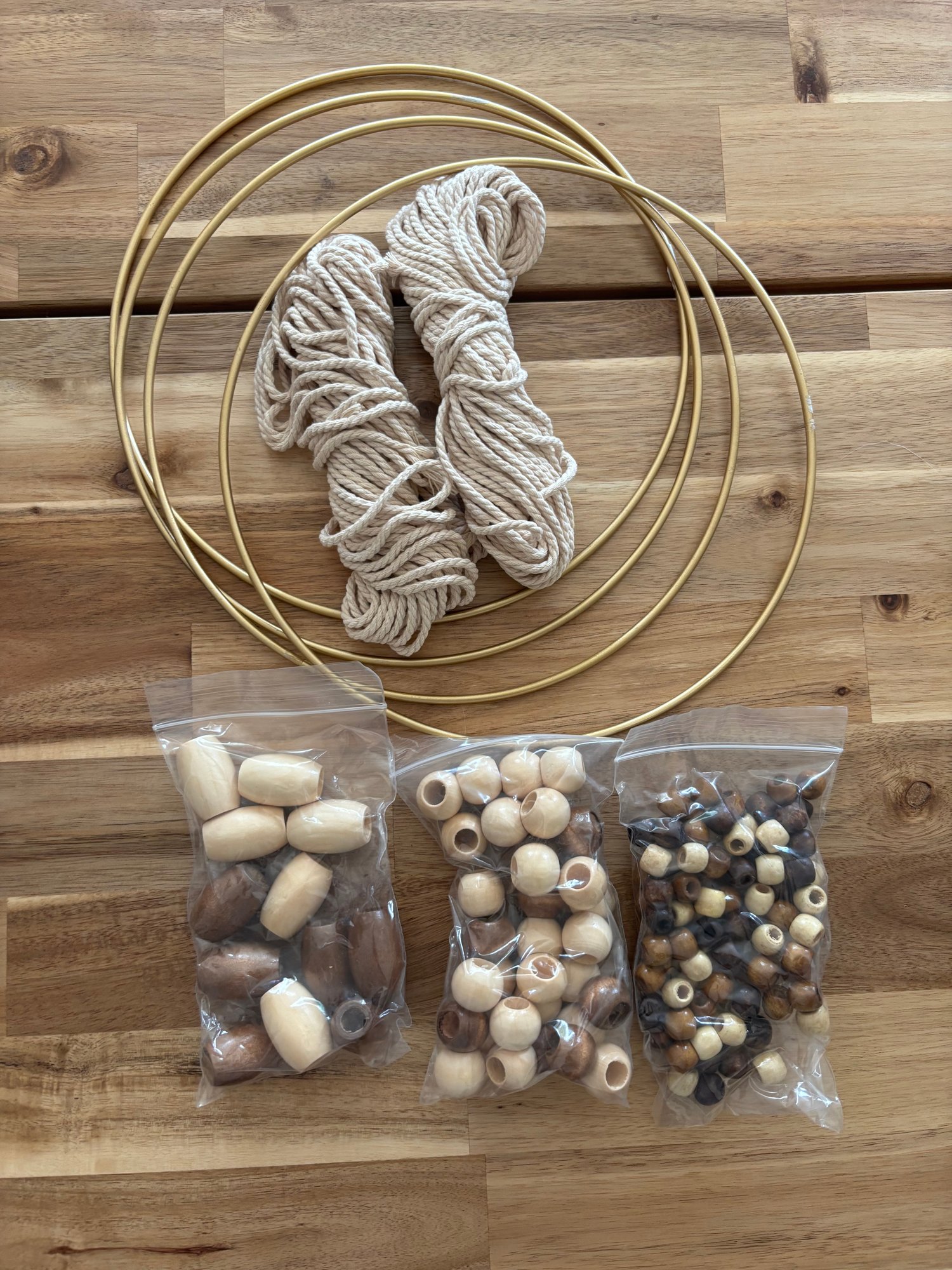 4 - 10” rings , 2 bundles of cotton fiber and natural beads.