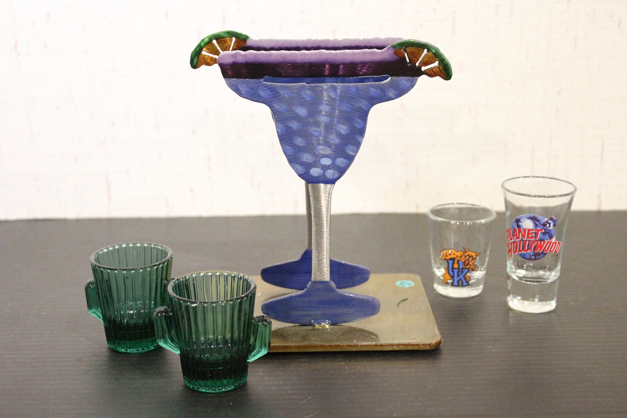 A margarita styled napkin holder at 8" tall with 2 green glass cactus shot glasses 2.5" , and Planet Hollywood 3" and UK shot glasses 2.5". These items can be shipped.