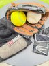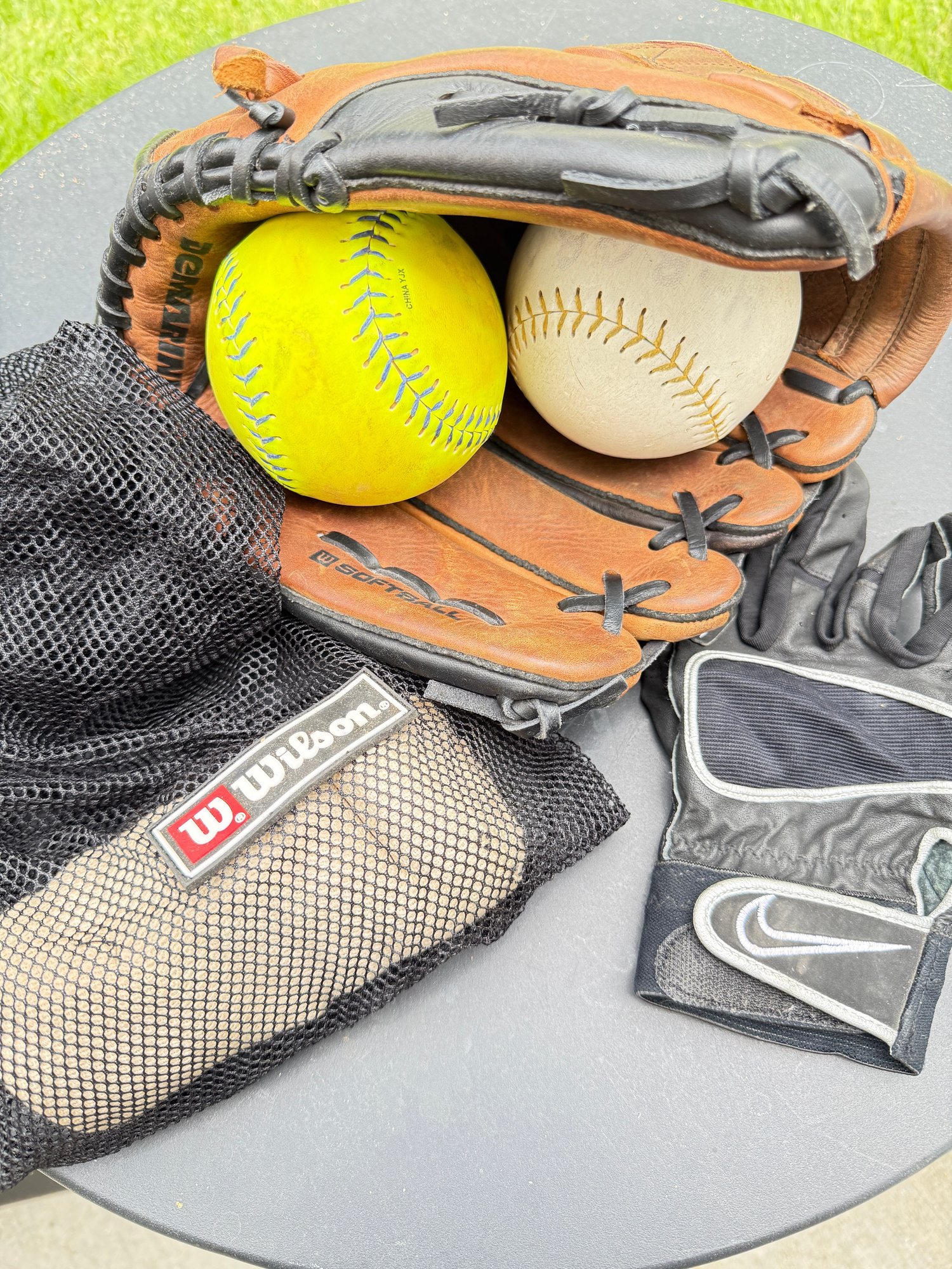 A collection of men’s baseball/softball equipment. Includes a Nike large leather batting glove with a Velcro and elastic wrist closure, ace bandage, men’s 13 inch softball glove and two softballs. Softball glove is gently used made of leather with a Velcro closure. All in very good condition.