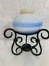 Beautiful glass candle holder with black iron like holder. Blue and white with a off white candle.