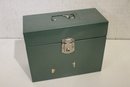 A portable metal file lockable box with key, 12.5" x 10" x 5.5". This item can be shipped.