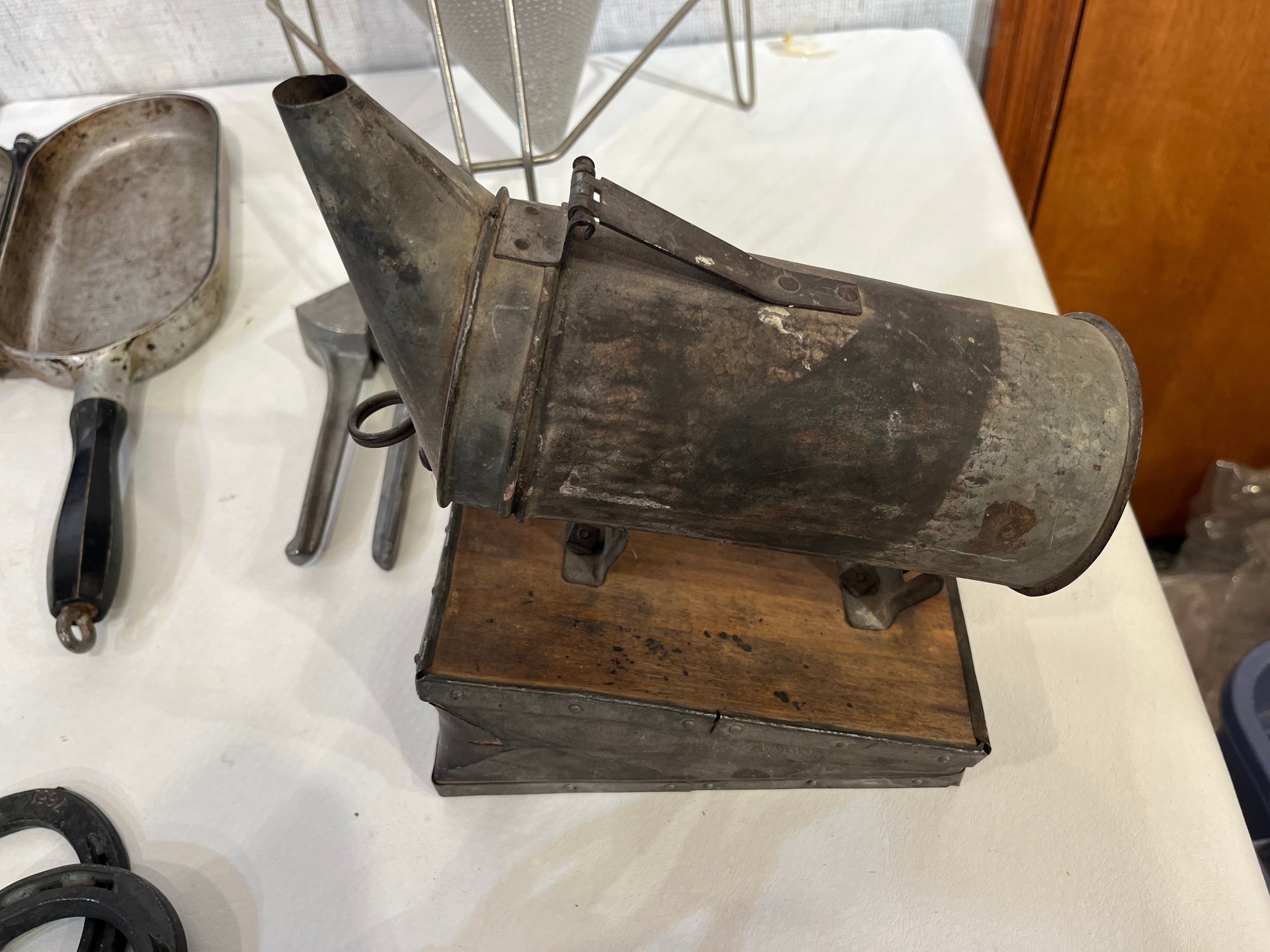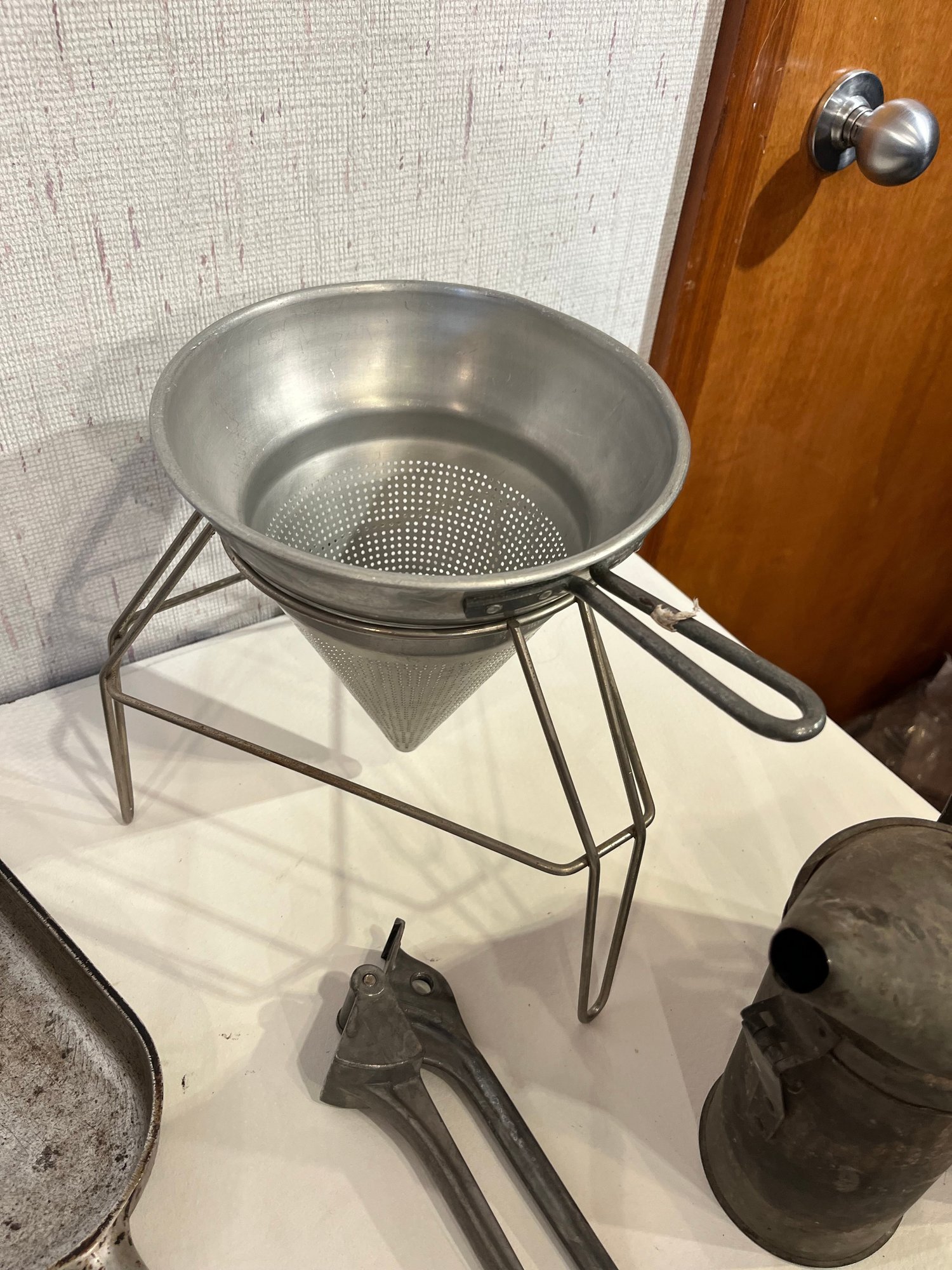 vintage aluminum cone colander or sieve with a stand, 7" across