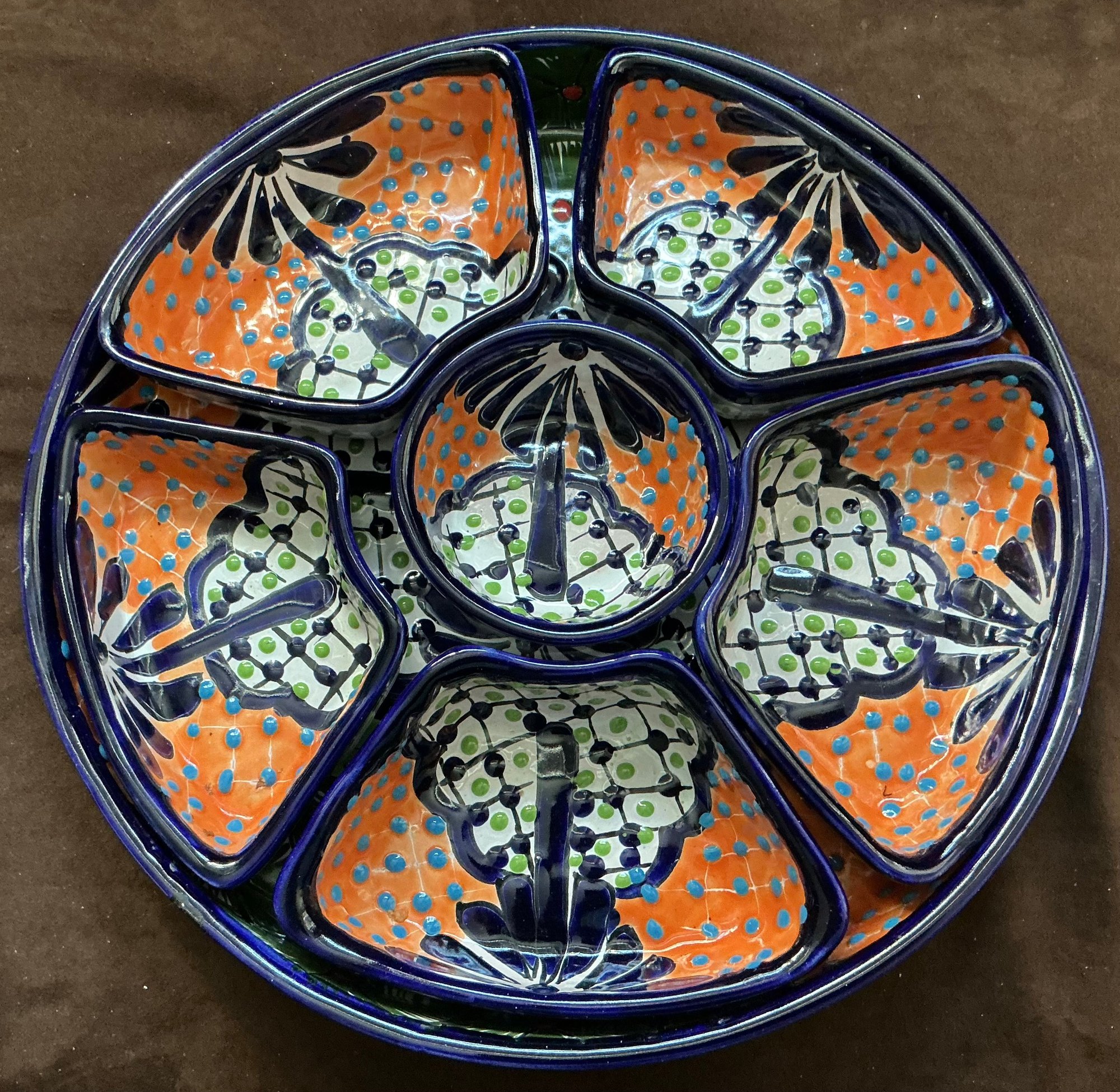 Beautiful tray that fits 5 wedge shaped dishes and one round on in the center. Made in Mexico with a sticker that says “for decorative use only “ on the back with a bird logo and Mexico.