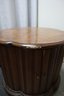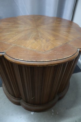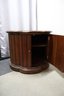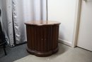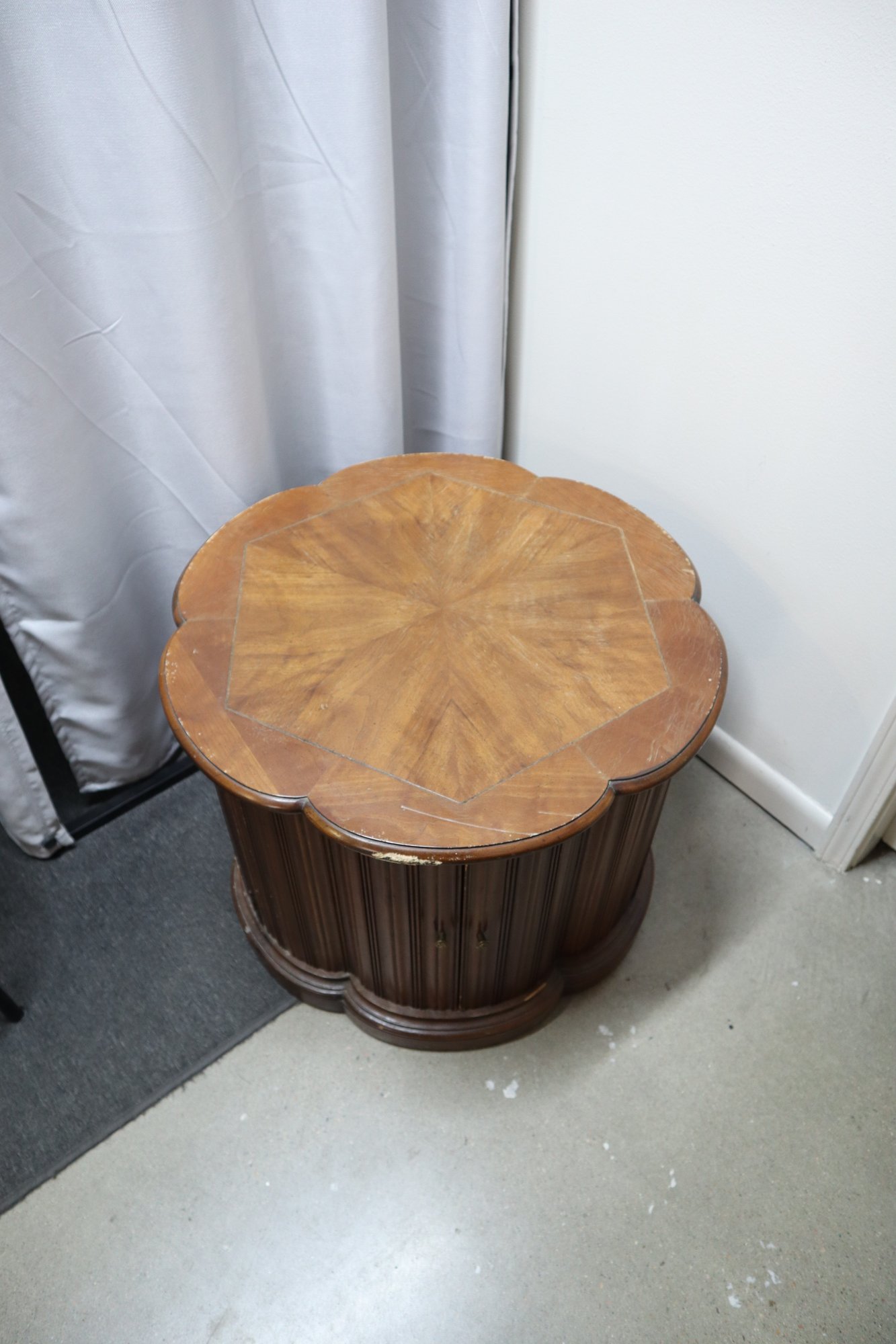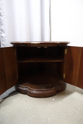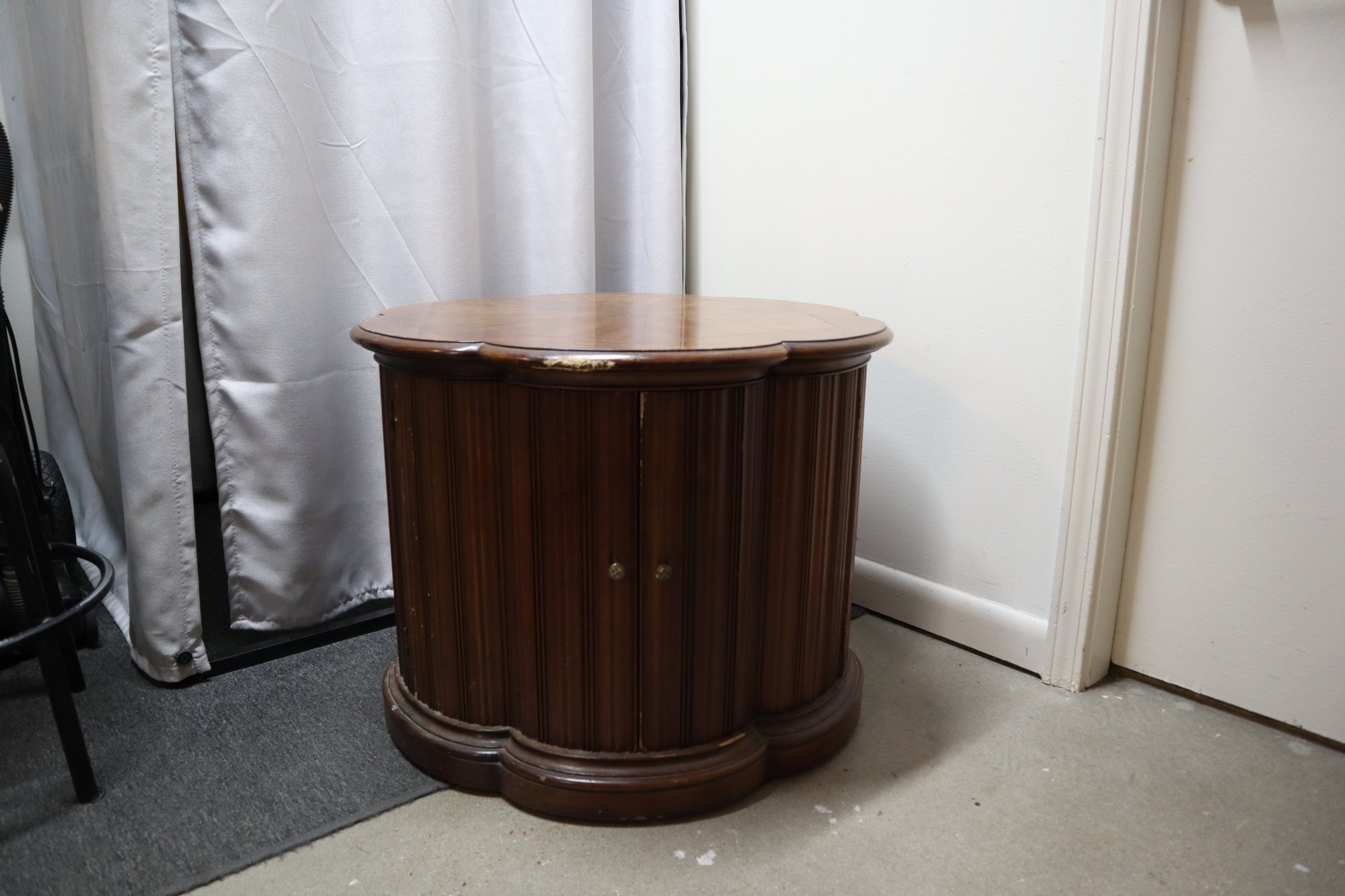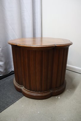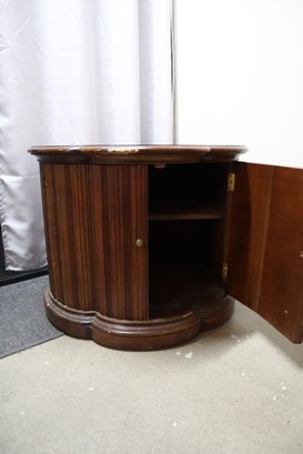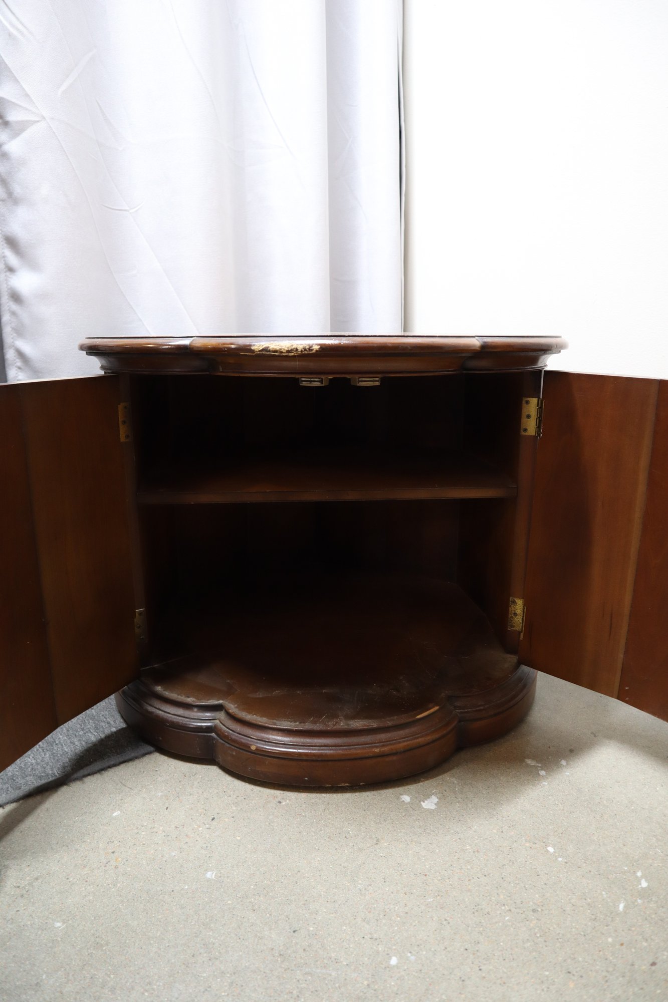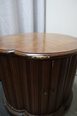 Solid wood end table in the mid century modern style. Has double doors that open to an interior with a shelf for storage. The doors latch with magnetic closures, one door sticks slightly. There is minor cosmetic damage from wear and one spot of deeper damage on the top, as well as a few dings in the doors. This Item will not ship.