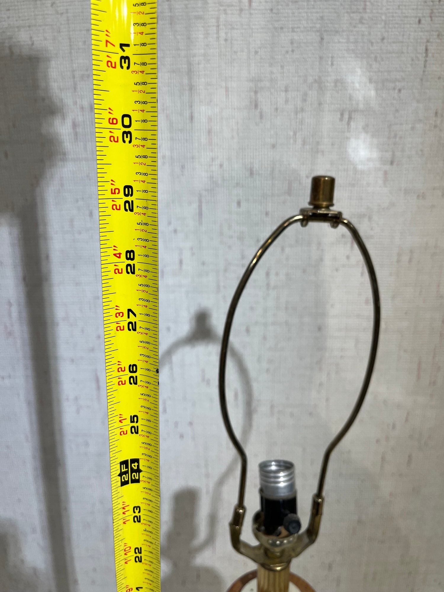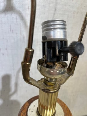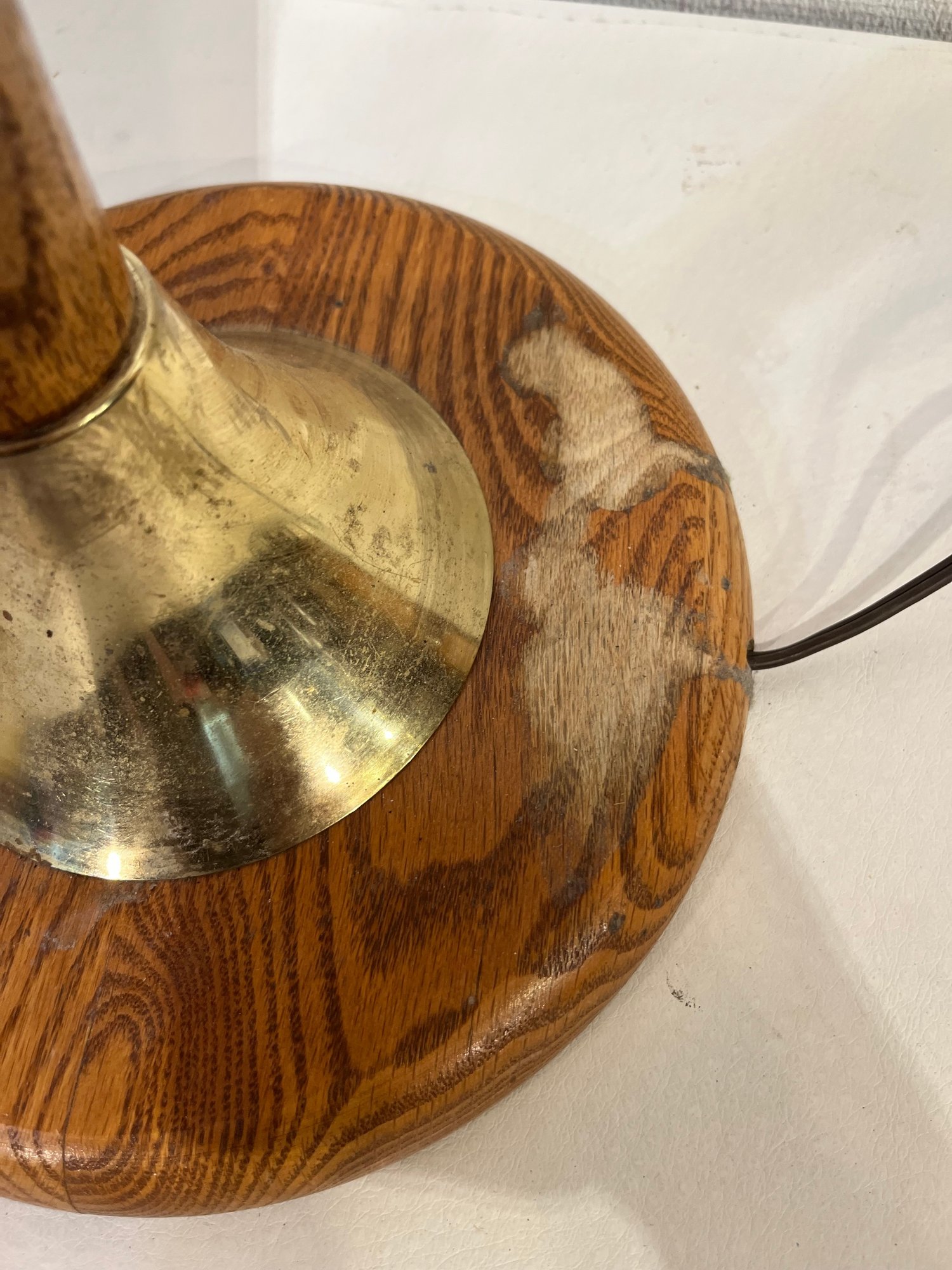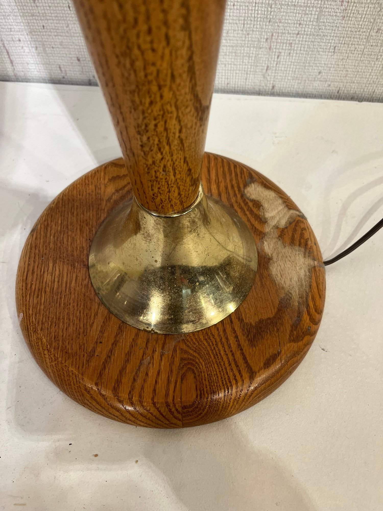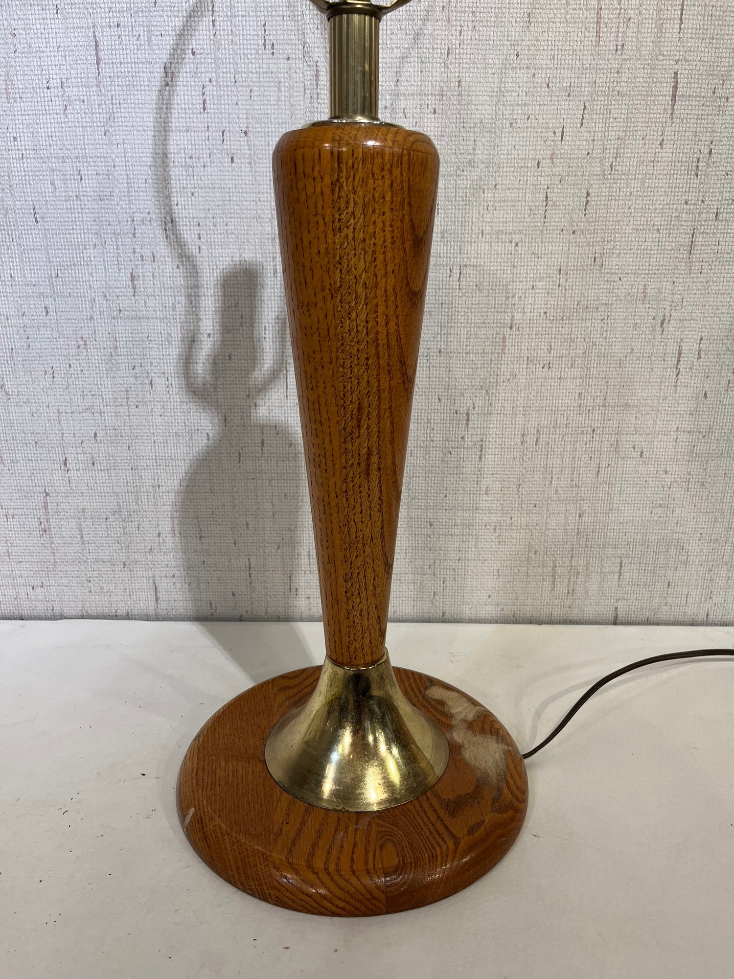 A mid-century modern oak wood and brass table lamp 30" tall, some staining at the base. This item can be shipped.